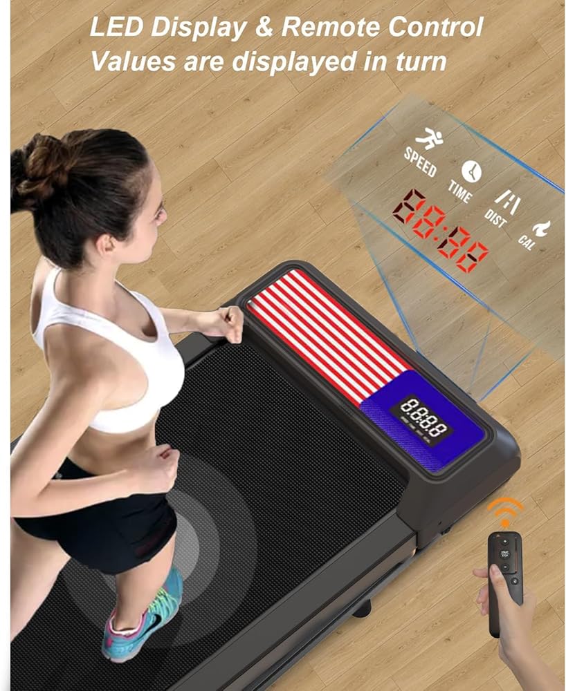 Remote control & LED display: Equipped with an LED display for convenient tracking of exercise data in real-time (including speed, time, distance, and calories burned via a four-data rotating display). No need to manually switch when working out. You can also use the remote control to speed up/slow down/pause, and even mute with one click.