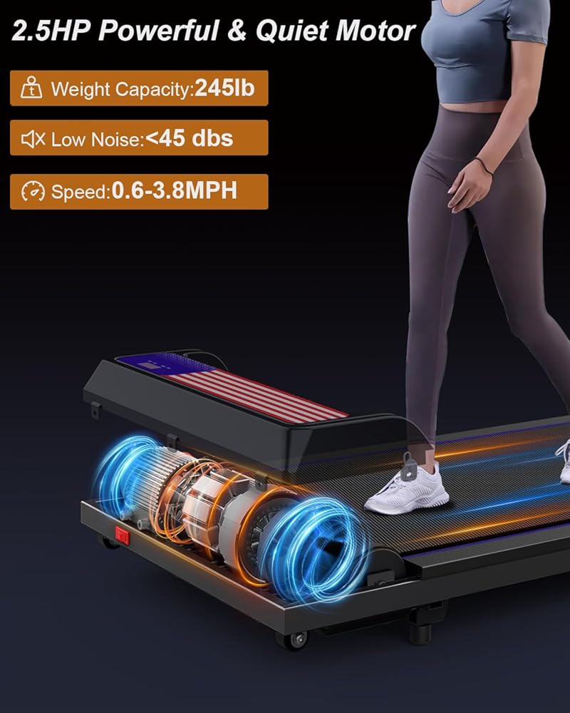 Powerful & silent motor: The under -desk treadmill/walking pad is equipped with a powerful 2.5HP motor with a maximum load of 265 pounds. With noise levels below 45 dBs, you don't have to worry about disturbing others. Enjoy quiet and comfortable exercise sessions when walking or jogging with the under-desk treadmill.
