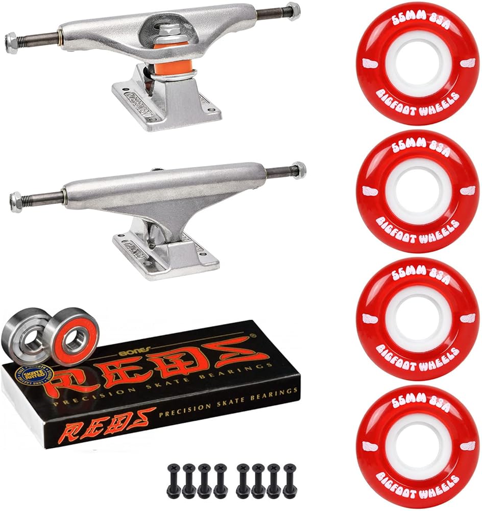 Set up your new deck or upgrade you current one with this Trucks/Wheel/Bearing/Hardware package! Independent Trucks, Bones Reds Bearings, 1" Hardware, and Bigfoot 83A Cruiser wheels, all in the color you wish to select! The all-new Bigfoot Cruisers offer a smooth rolling, 83A urethane on a typical street-sized skateboard wheel. Fast and quiet, these are ideal for riding the roughest spots. Filmers love these wheels! A high-rebound formula makes these wheels fast and smooth. The hard plastic core allows for precision bearing alignment which keeps these wheels rolling fast (soft wheels without a core put restrictive pressure on bearings during turns which slows you down). At 32mm wide, we pretty much took a normal street wheel and scaled the durometer down to 83A. Also included is a set of Independent trucks in a variety or sizes. Durable, high performance truck for all types of skateboarding. 356 T6 Aluminum hanger and baseplate, solid Chromoly steel axle, grade 8 kingpin, Supercush cushions with cylinder bottom. Featuring superior turn and stability, better grind clearance, improved no hang-up yoke for grind tricks, and less wheel bite. They last longer and are stronger on impact than any other truck on the market. Independent trucks are Made In The USA. To finish out the package we include a set of Bones Reds bearings and 1" hardware.