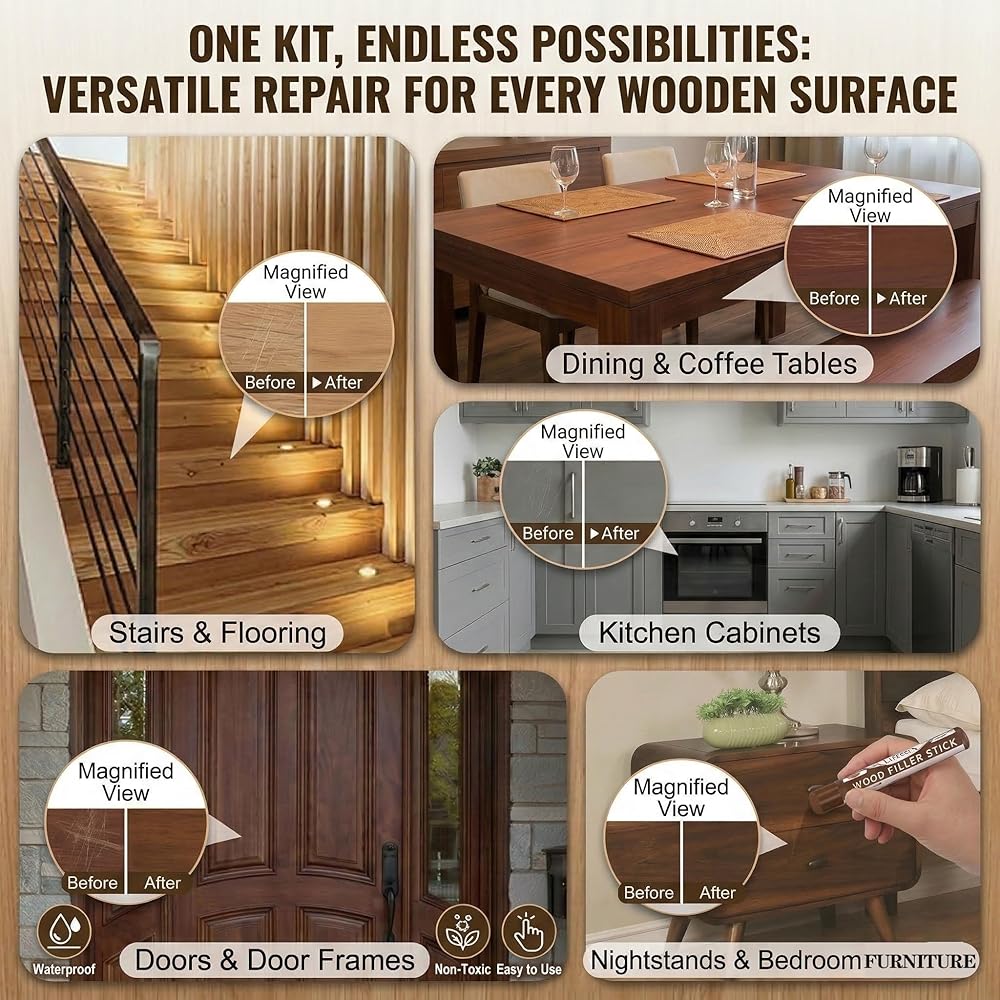 تطبيق سهل: لا توجد خبرة مطلوبة! بالنسبة للخدوش ، ما عليك سوى تطبيق عصا حشو الخشب مباشرة واكتشف أي فائض. من أجل الشقوق أو الثقوب الأعمق ، قم بإذابة تلوين الشمع ، وملء الفجوة ، وسلسها. تجعل صيغة سهلة الاستخدام لدينا إصلاحات خشبية DIY نسيم لأي شخص ، وضمان نتائج ممتازة دون مهارات أو أدوات خاصة.