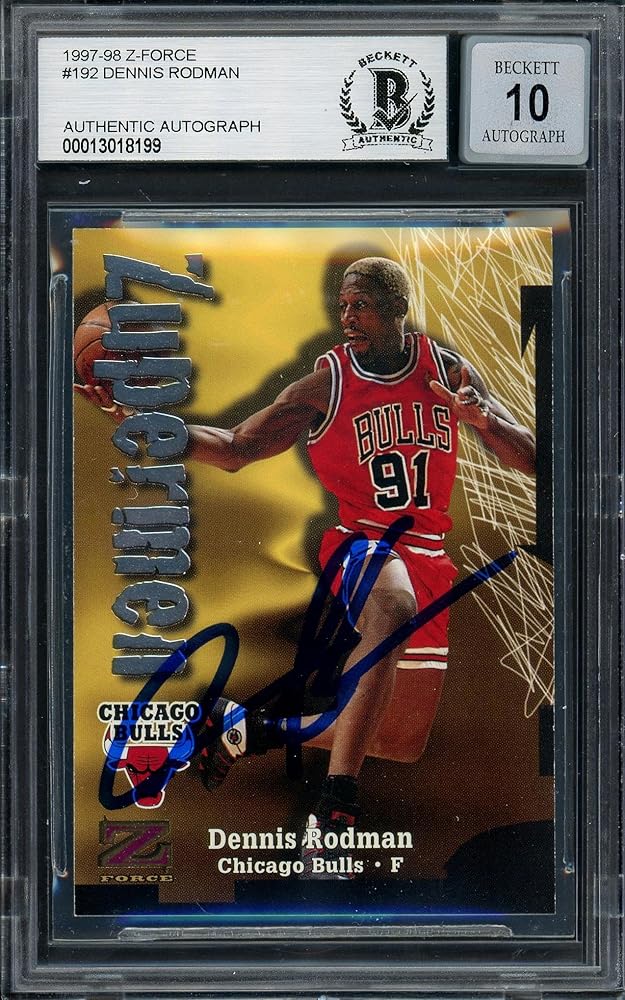 Dennis Rodman Autographed 1997-98 Skybox Zuperman Card #192 Chicago Bulls Auto Grade Gem Mint 10 Beckett BAS #13018199 . If a product is unsigned or non game-used, a hologram will not be included. Dennis Rodman memorabilia. Chicago Bulls memorabilia.