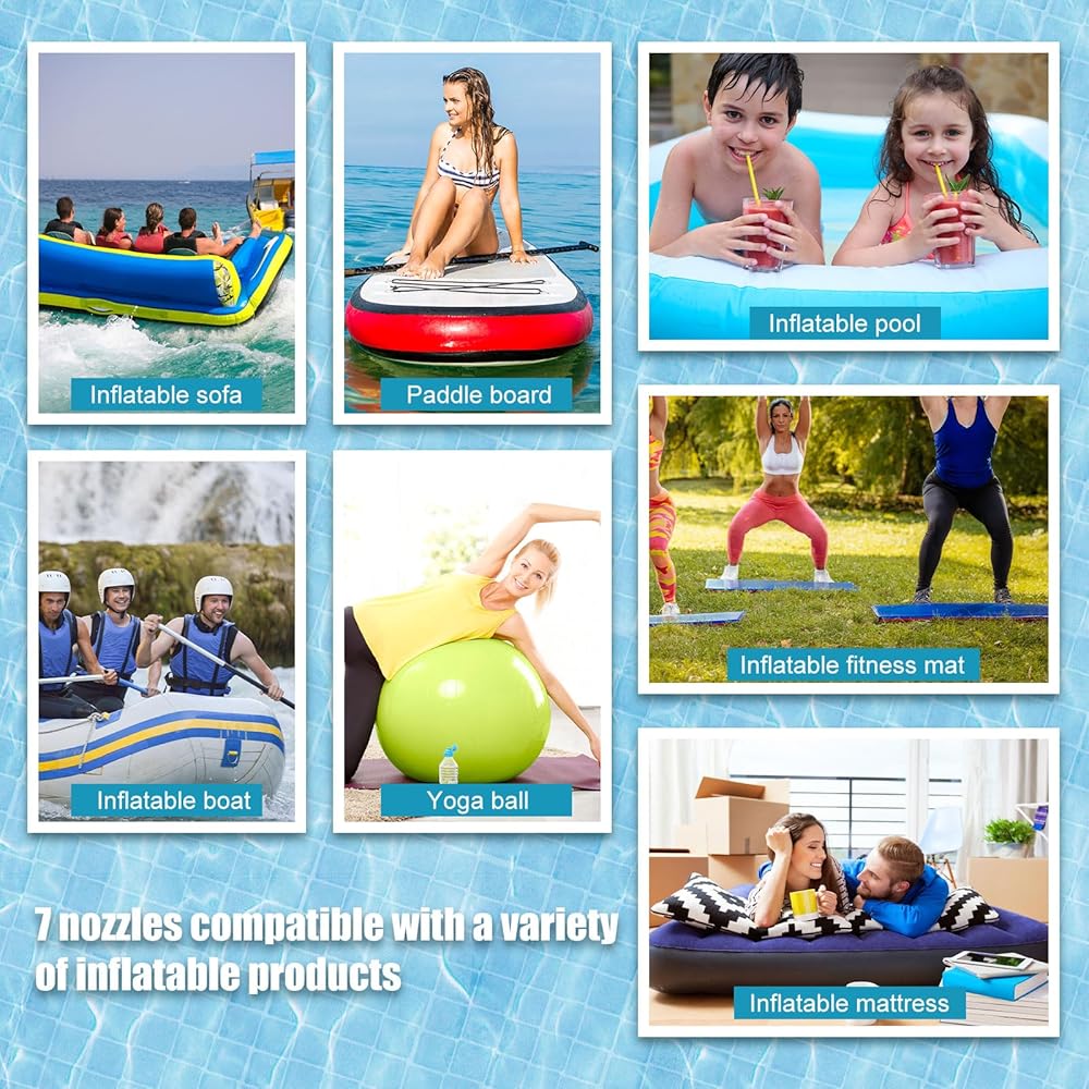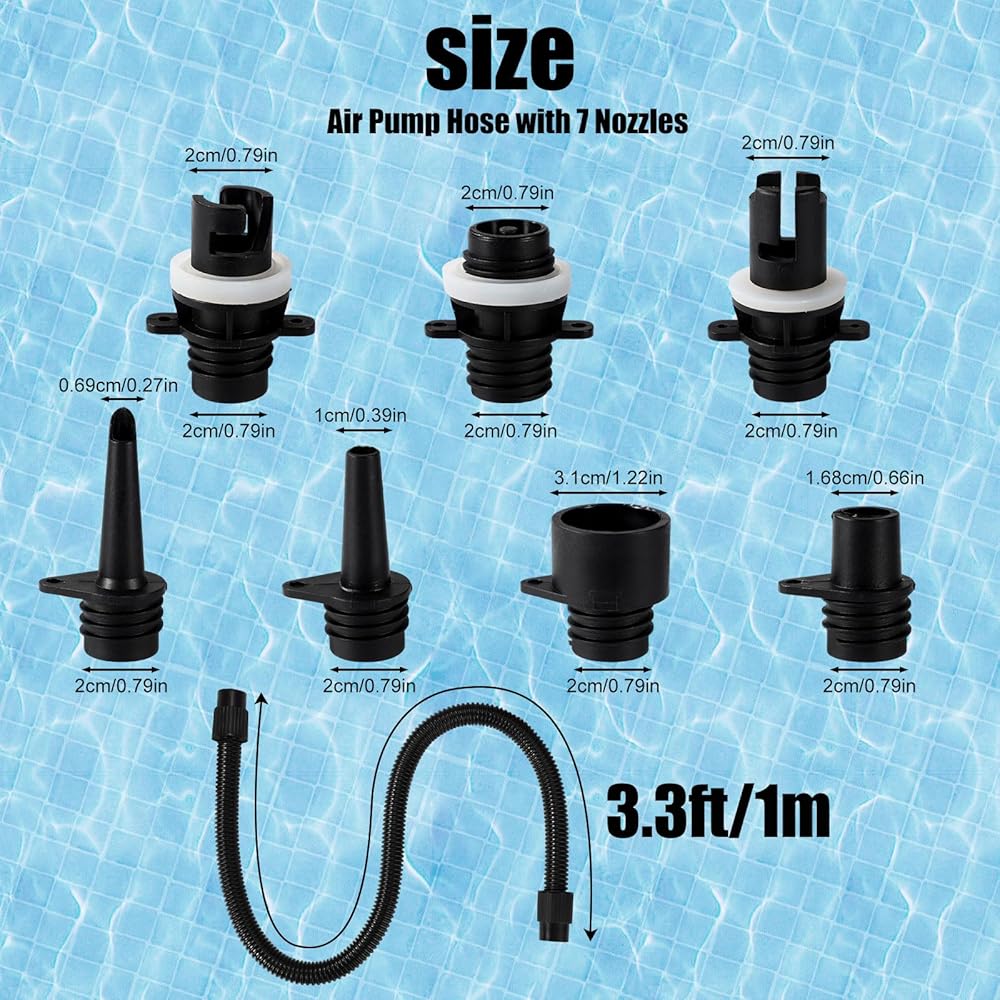 Compatibility: This paddle board pump adapter set fits most electric paddle board pumps (screw-in type) and inflatables including kayaks, boats, tents, and pools. It comes with 7 nozzles to cover all standard valve types for seamless inflation.