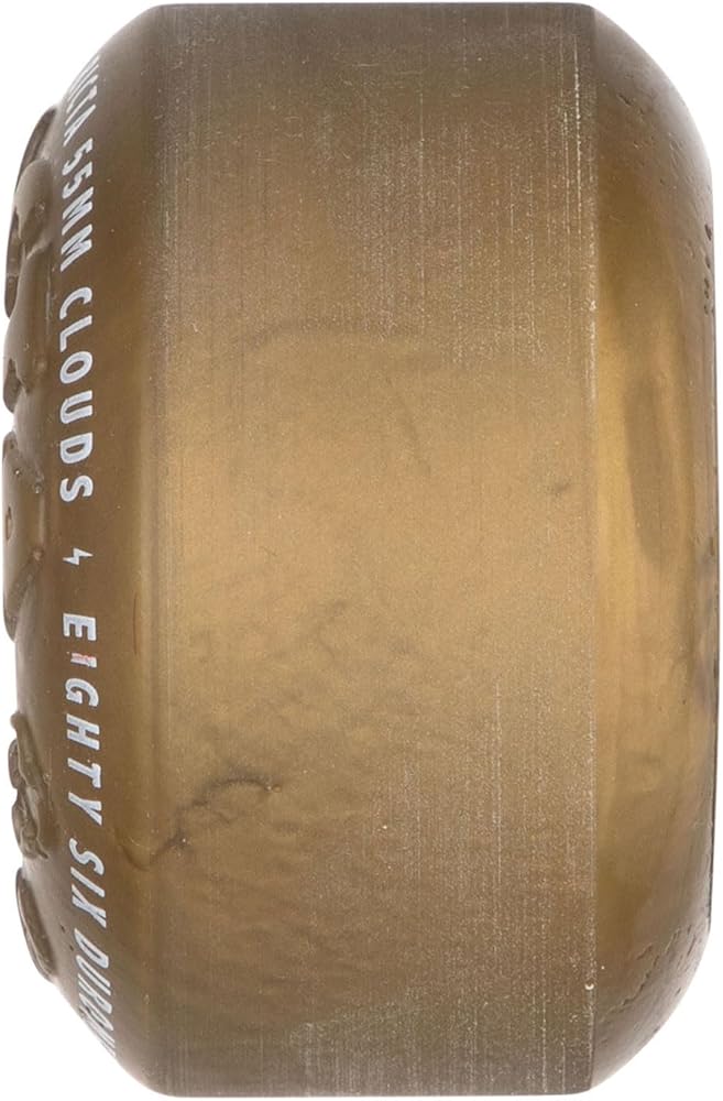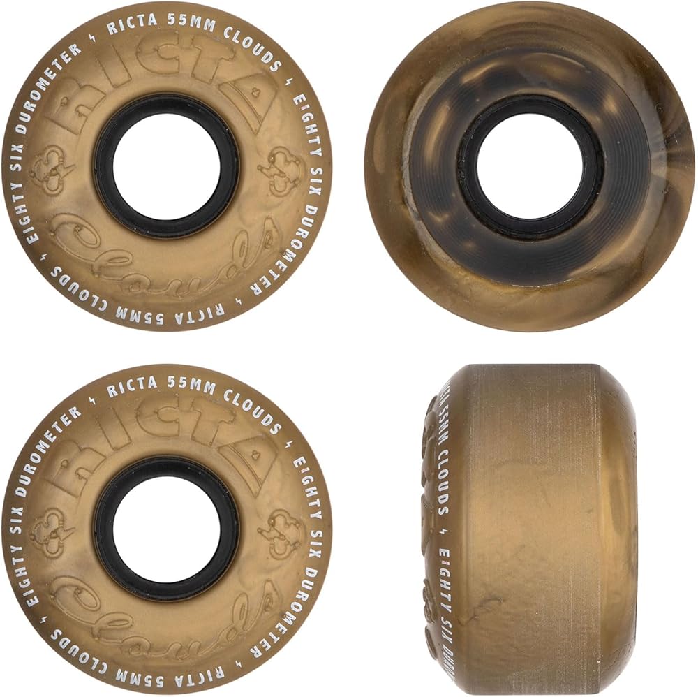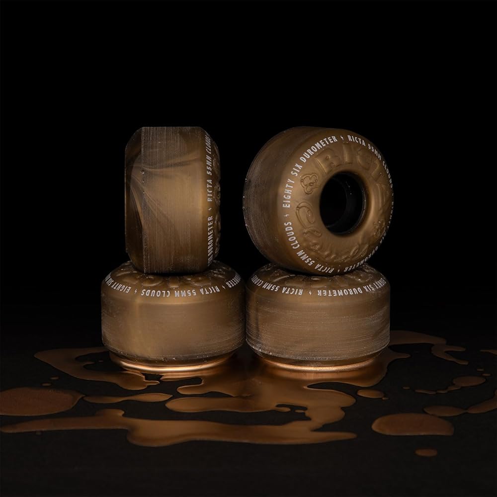 Ricta Wheel Dynamics 55mm, 86a Clouds in metallic gold with black core and debossed and pad printed lettering. Medium-soft urethane for filmer setups, skating ditches and rougher terrains.