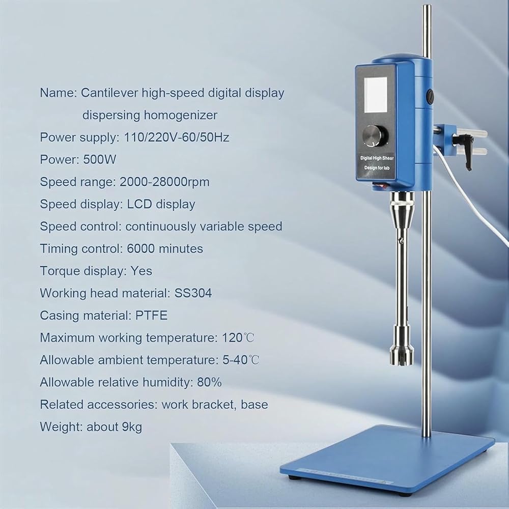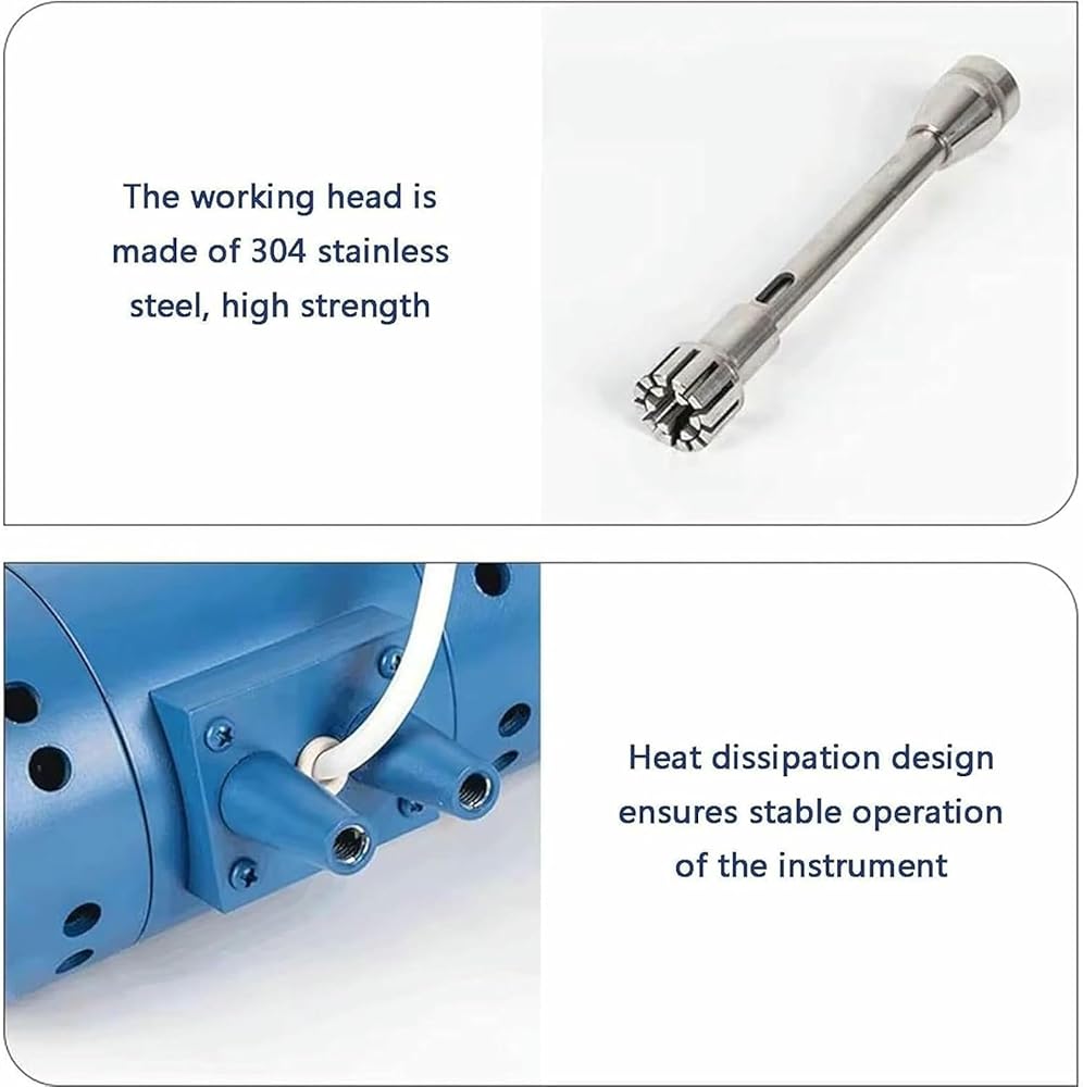 • High Speed Homogenizer: Crafted from 304 Stainless Steel, this durable work head offers exceptional strength and corrosion resistance. The adjustable head position allows for customized operation, ensuring optimal performance. Featuring a stable chassis and an efficient heat dissipation design, this homogenizer is perfect for various applications in laboratories and food processing.