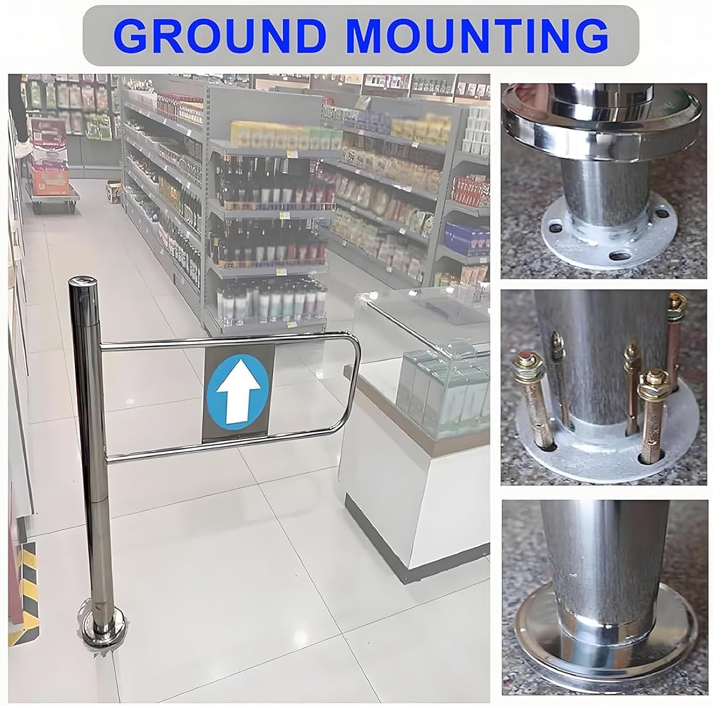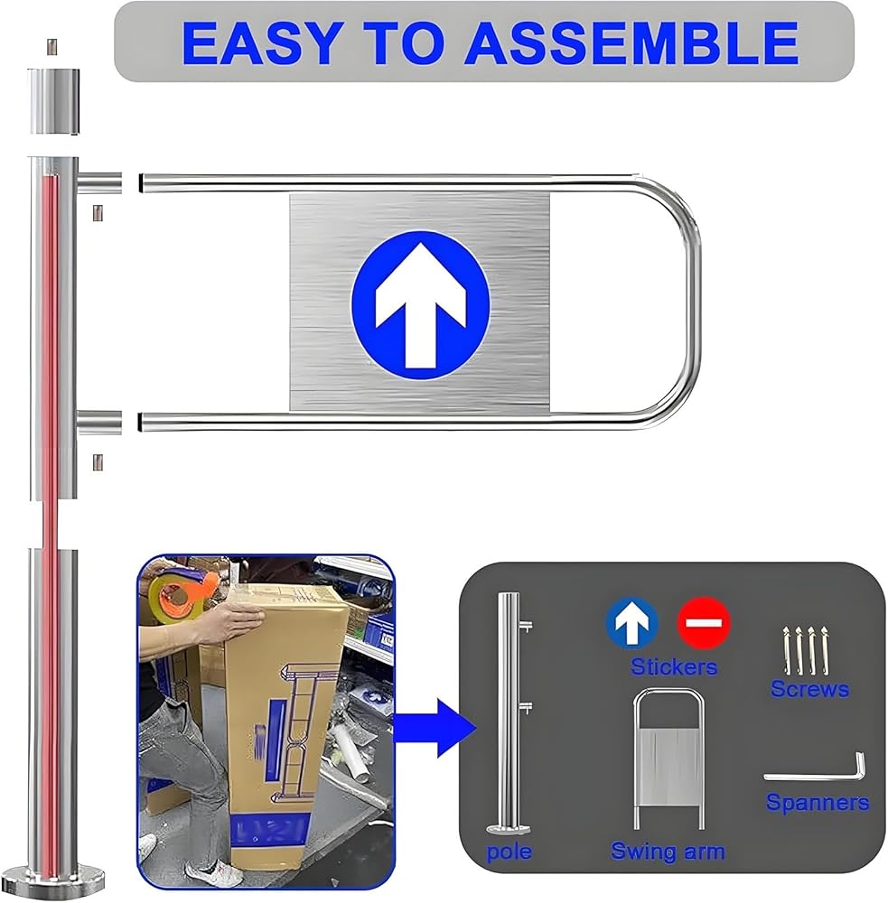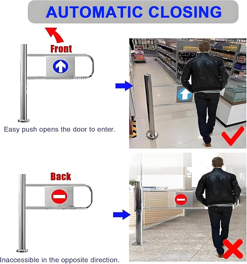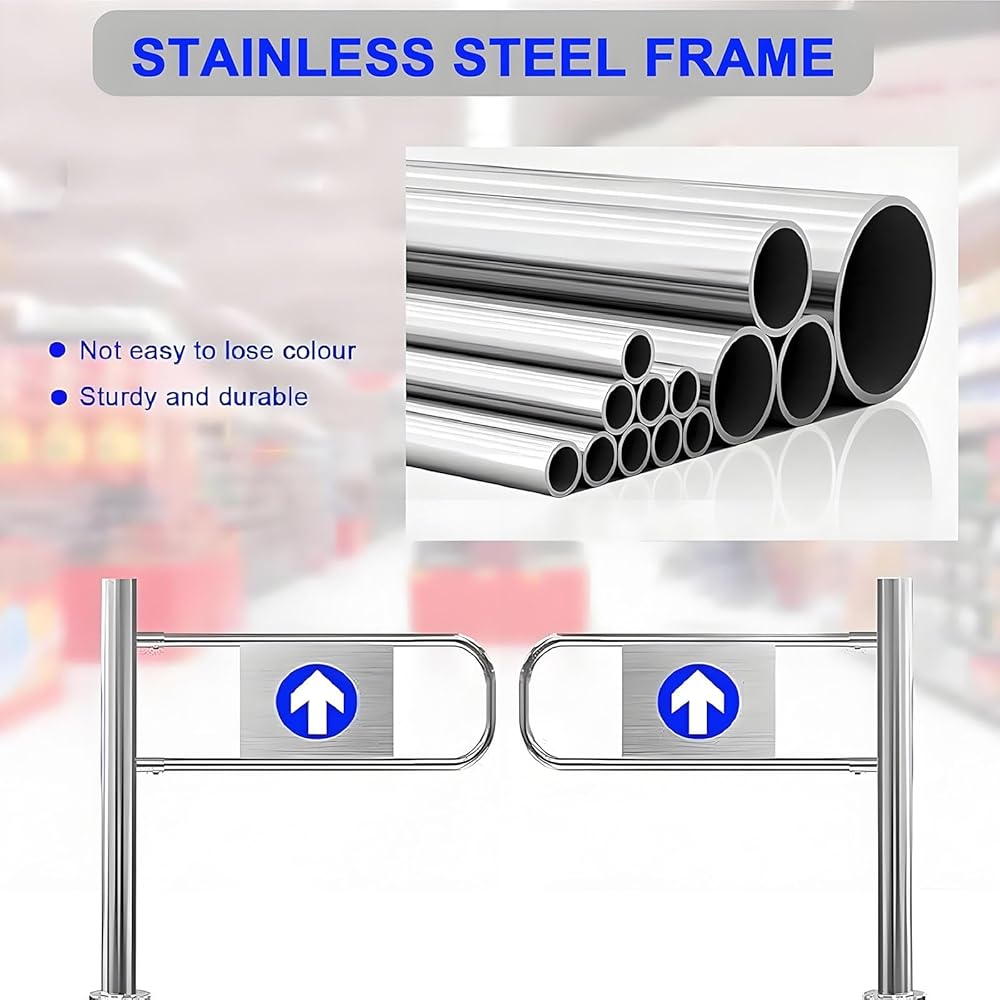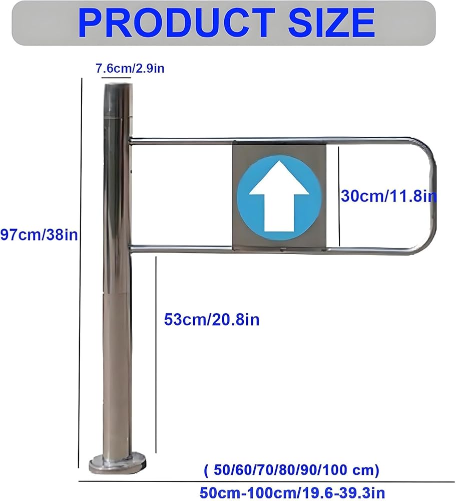**Key Features:** - Height: 97 cm (38 inches) – ideal for various environments - One-way entry design ensures effective crowd management - Made from robust stainless steel for long-lasting durability - Compact footprint for easy installation; ready to use after setup - Securely fixed with expansion screws to minimize tipping risk - Spring-loaded for automatic closing after use - Simple push-to-open operation for seamless transitions **Specifications:** - Color: Silver - Height: 97 cm / 38 in - Length options: 50/60/70/80/90/100 cm (custom lengths available) - Swing arm heights: 30 cm / 11.8 in (top), 80 cm / 31.4 in (upper), 50 cm / 19.6 in (lower) - Installation method: Drilling - Perfect for warehouses, construction sites, traffic guidance, garages, parking lots, and work zones **Package Includes:** - 1 x one-way pedestrian passage door (other items not included) **Important Notes:** - The package contains only the swinging door (other display items are not included). - This gate is designed for one-way pedestrian guidance and is not a security barrier. - Color may vary slightly due to lighting and screen differences. - Dimensions may have slight variations due to manual measurement.