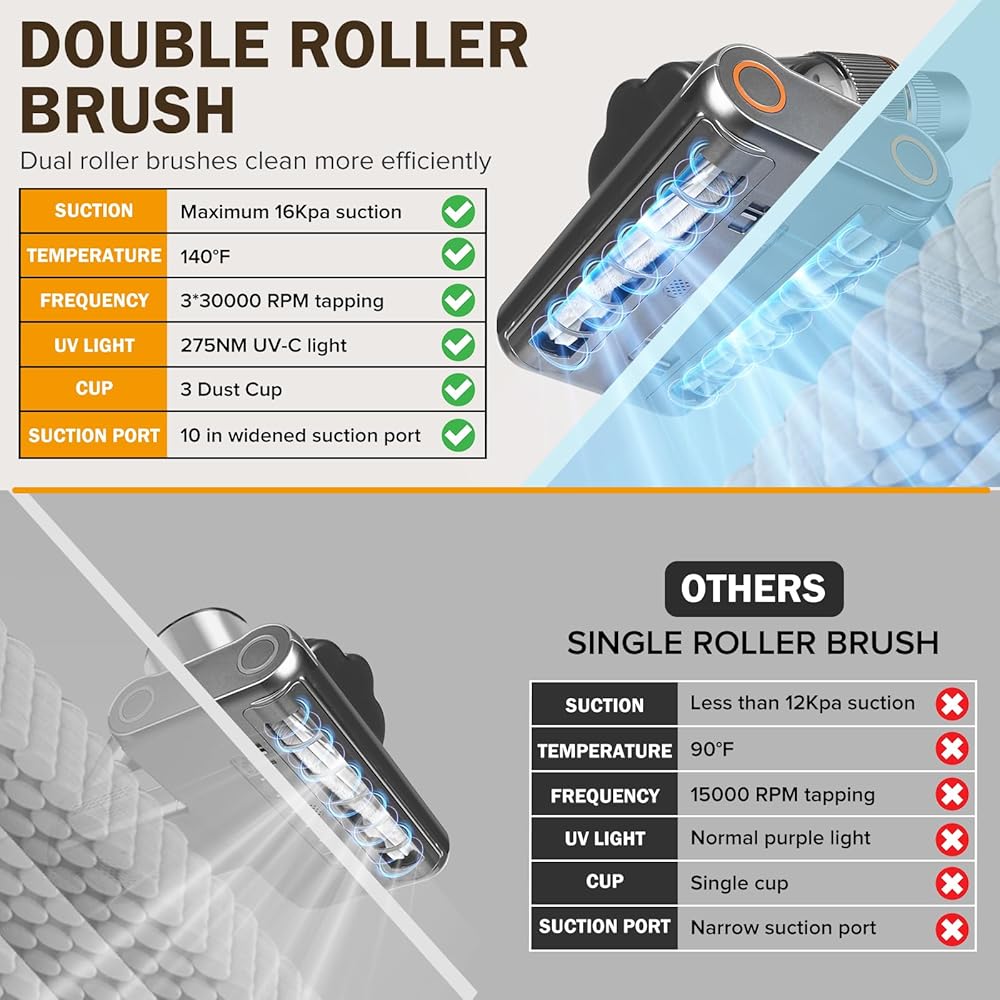 التكنولوجيا المبتكرة لخمسة أضعاف: الجمع بين ضوء 257nm UV-C ، وفرشاة أسطوانة مزدوجة 30،000 دورة في الدقيقة ، و 140 درجة فهرنهايت ، وموجات بالموجات فوق الصوتية ، وخاصة مفيدة خلال موسم الرطب. يرفع بقوة شعر الحيوانات الأليفة ، و dander أثناء حماية أسطح النسيج.