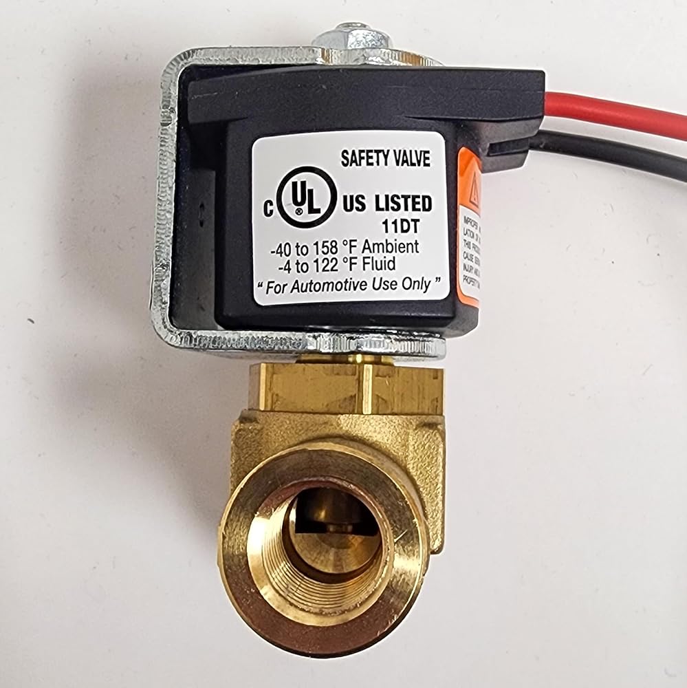 Featuring a robust brass construction with 1/4 inch connections, the UL-listed valve operates reliably in ambient temperatures from -40°F to 158°F and fluid temperatures from -4°F to 122°F. Perfect for LPG and air shut-off applications, this 12V solenoid valve comes with integrated safety features and directional flow indicators cast into the brass body. The valve includes red and black wire leads for straightforward electrical installation. Its industrial-grade construction ensures dependable performance in demanding automotive environments.