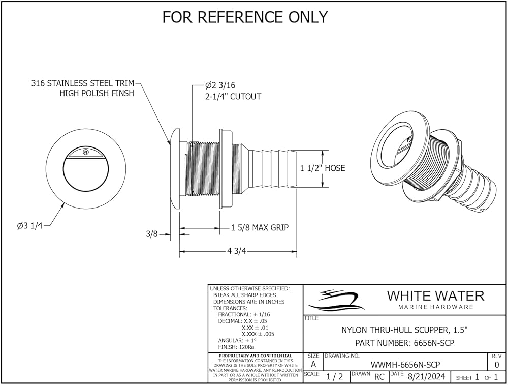 • 𝗩𝗘𝗥𝗦𝗔𝗧𝗜𝗟𝗘 𝗨𝗦𝗘: The White Water 6656N-SCP scupper is engineered for thru-hull applications, making it suitable for a wide range of marine vessels, including boats and yachts. Its efficient design facilitates effective water drainage from the transom area, preventing backflow and maintaining a dry and safe deck environment. This versatility ensures compatibility with various marine plumbing configurations.