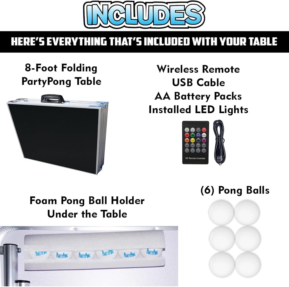 • INCLUDES: PartyPong Beer Pong Table, (6) high-quality PartyPong beer pong balls & Foam beer pong ball holder underneath the table.