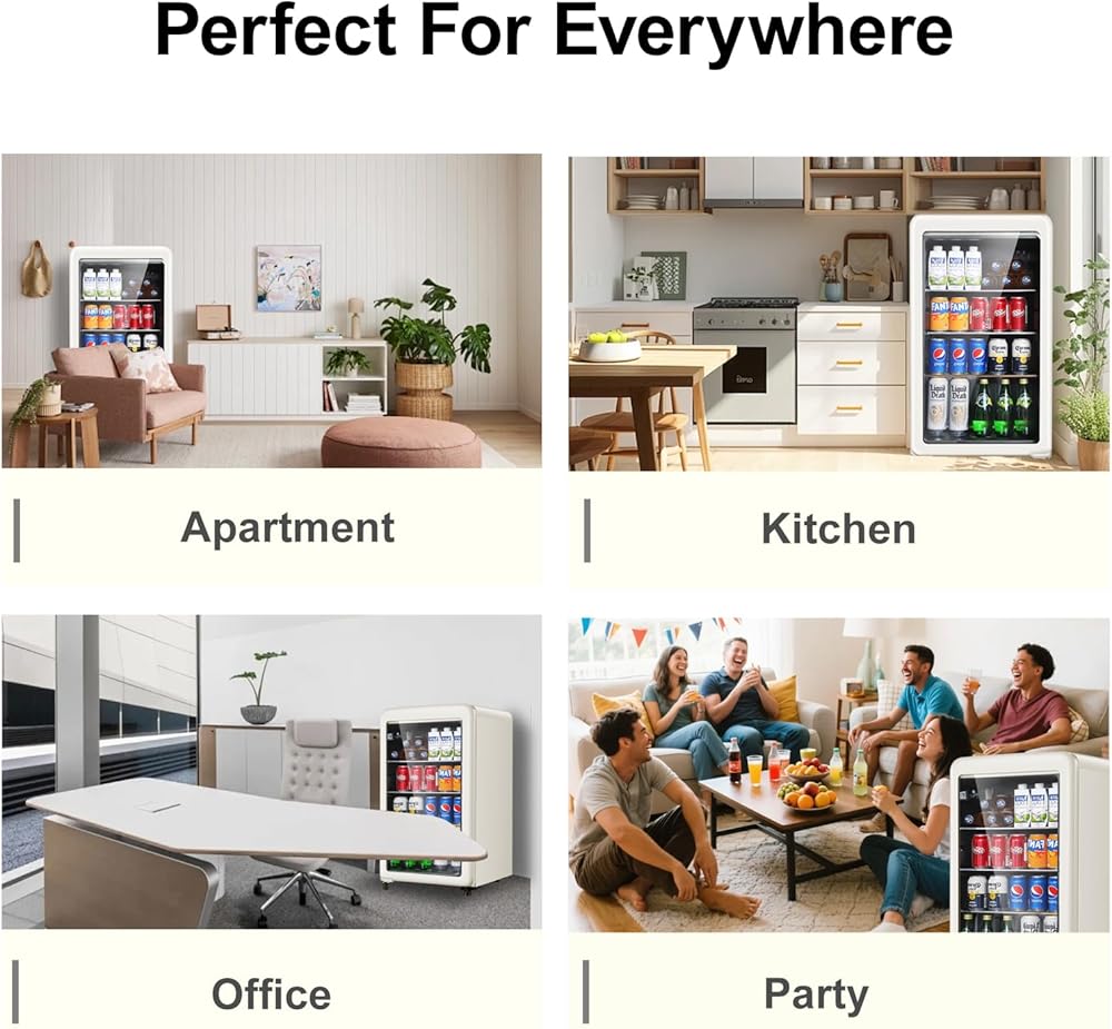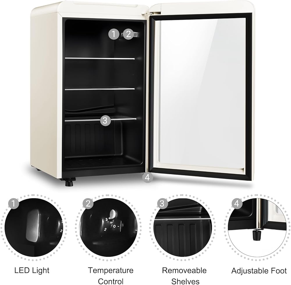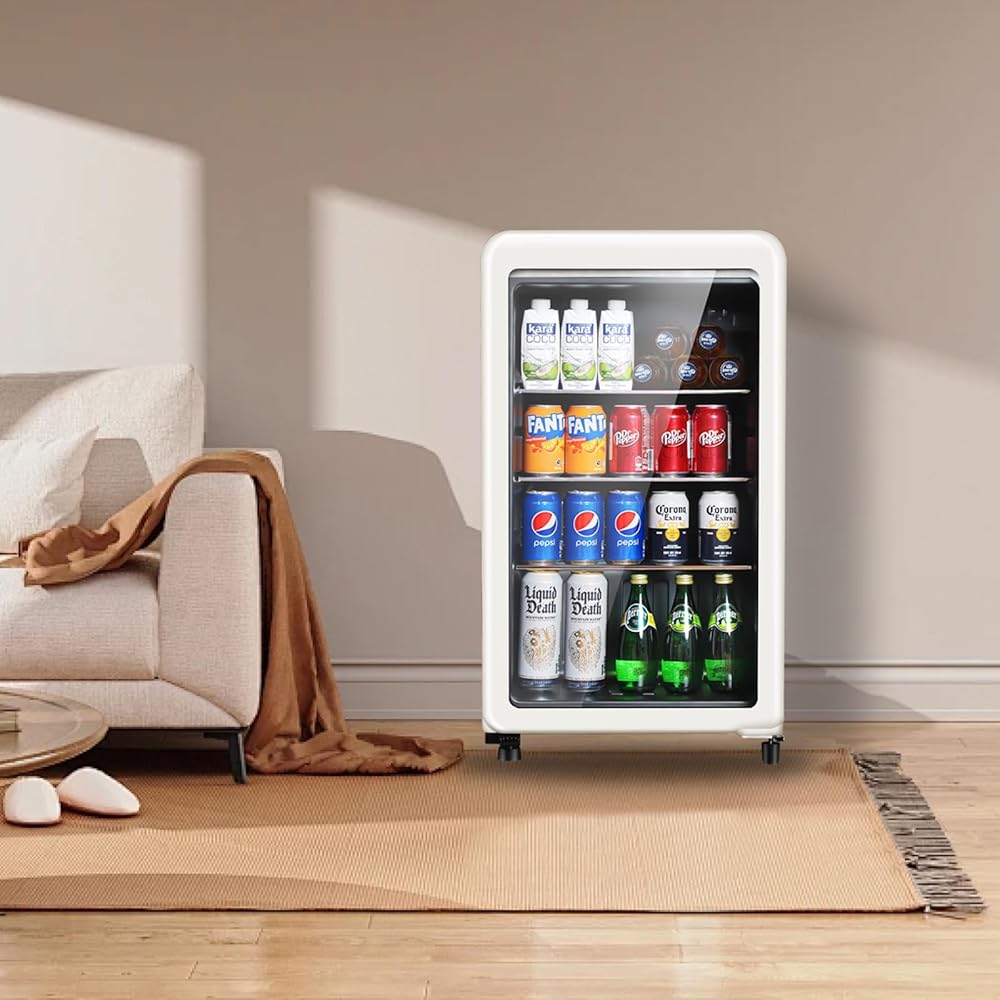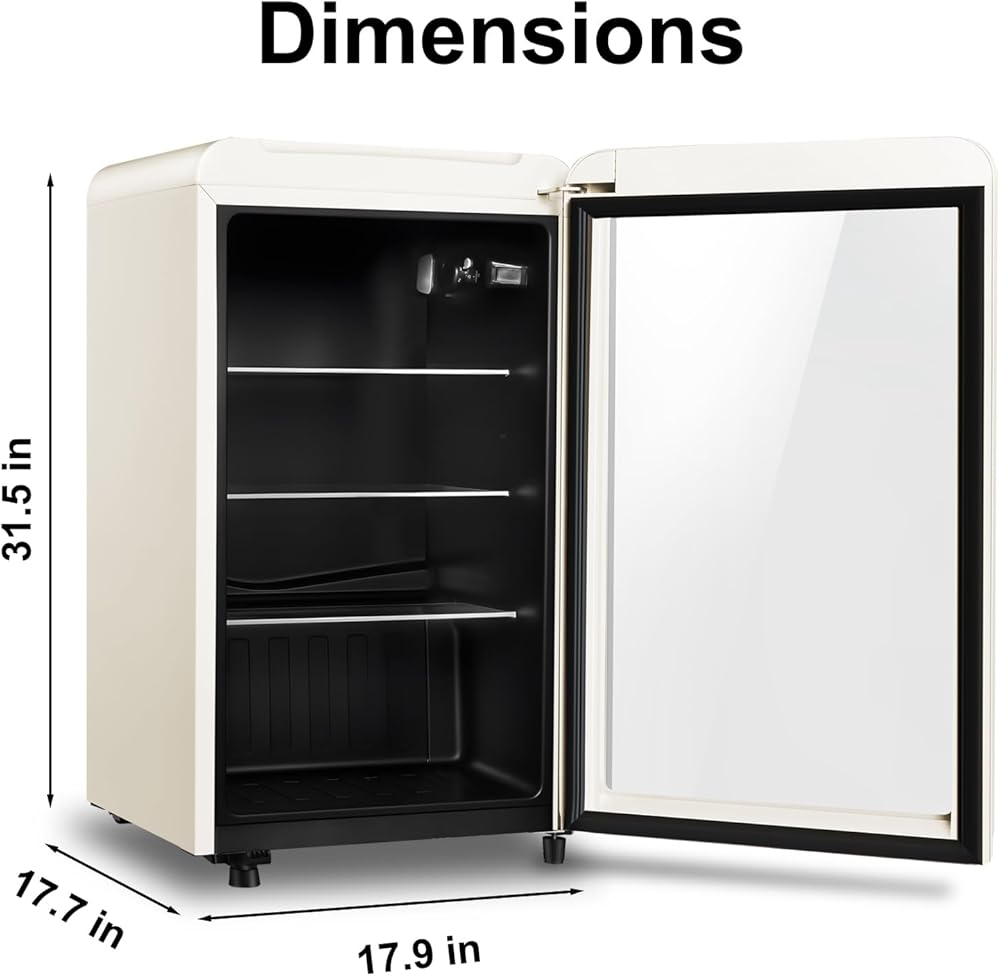 • Timeless Retro Style - Add a nostalgic touch to your home or office with this stylish beverage cooler, featuring a retro design with a crisp white finish and glass door for a sleek look. Size: 17.9inch*17.7inch*31.5inch