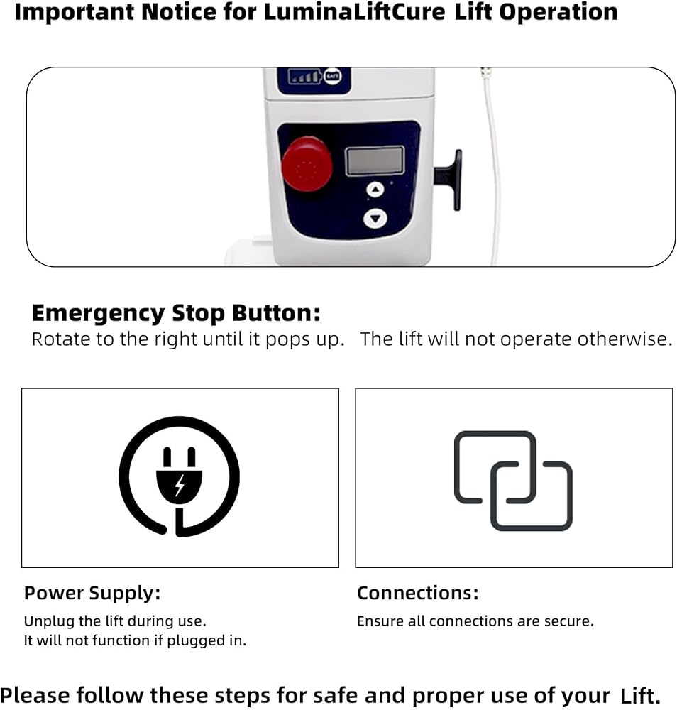 الطاقة الفائقة: يحل محرك Motek الكهربائي مع قوة رفع قدرها 8000 N بسهولة محل قوة العضلات اللازمة لتحريك الشخص. يميل هذا المصعد الكهربائي إلى أن يكون أكثر أمانًا لمقدمي الرعاية الذين يرغبون في إنقاذ ظهورهم عند تحريك أحبائهم. ملاحظة: لا يمكن استخدام مصعد المريض الكهربائي أثناء الشحن