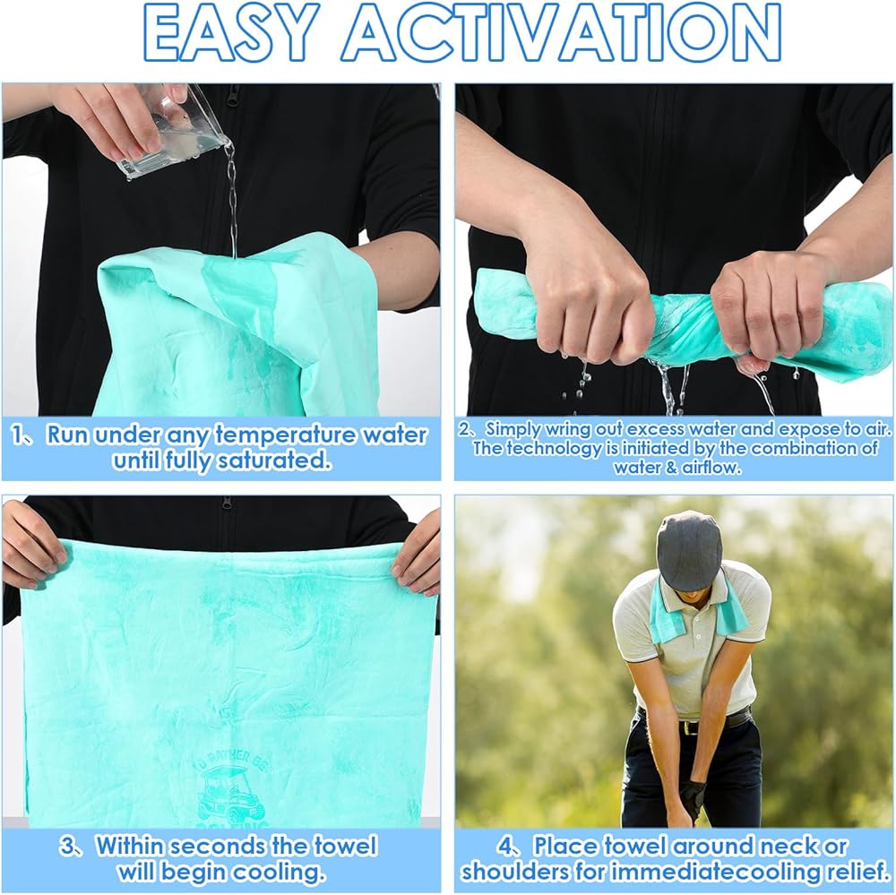 This cooling towel is chemical-free and stays cool for up to 3 hours. It's great for hot flashes, outdoor activities, exercise, heatstroke prevention, sun protection, and absorbing while cooling. To activate, simply soak, wring, and shake.