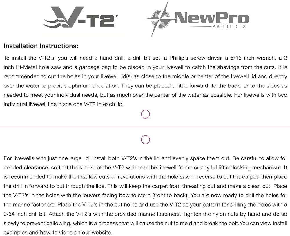 The V-T2 is your one source for livewell fish care! In a sport as competitive as tournament fishing, a dead-fish penalty can be the difference in cashing a check or going home empty handed. This is why we developed the patented Jimmy Houston's Signature Series V-T2 Livewell Ventilation System; a unique, low-cost boat livewell modification that will simplify your fish care management by addressing all stressors that harm fish in your boat's livewell. The V-T2 allows continuous oxygen to flow inside of your livewell and provides a release for heat and harmful metabolic gasses. Incredibly easy to install, the V-T2 mounts flush to your livewell lid and only requires a drill, hole saw bit, drill bit, screwdriver and a few short minutes. In addition, the New Pro Products V-T2 Livewell Ventilation System needs no electricity, so it won't tax your already-overloaded batteries. Universally adaptable to any livewell, the V-T2 Livewell Ventilation System is an easy and cost-effective way to ensure your fish are strong, healthy and ready for the release. The V-T2 is trusted by thousands of serious anglers around the globe as their best source for optimum livewell fish care. Raise your livewell fish care game today!