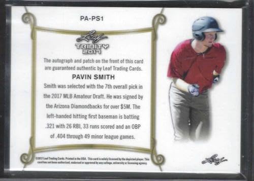 PAVIN SMITH 2017 LEAF TRINITY PROSPECT GAME WORN PATCH AUTO #D 1/1 . If a product is unsigned or non game-used, a hologram will not be included. Pavin Smith memorabilia. Arizona Diamondbacks memorabilia.