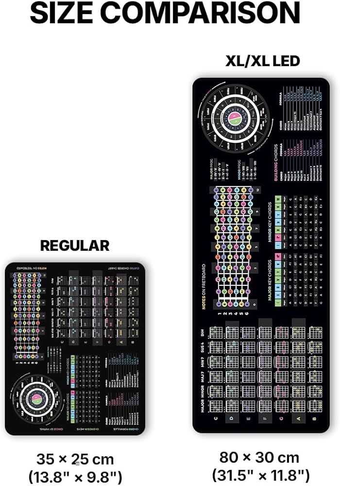 ✔ 42 must-know chords with clear diagrams ✔ Full fretboard note chart ✔ Popular chord progressions and in-key chord groupings ✔ Circle of fifths, chord construction, and music theory layout ✔ Right-handed layout only ✔ Smooth neoprene surface with anti-slip backing