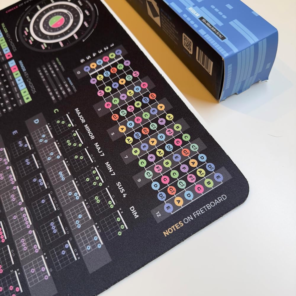 Elevate your guitar skills with the Guitar Theory Cheat Sheet Mousepad — a visual learning tool designed to help you understand chords, scales, and theory concepts faster.