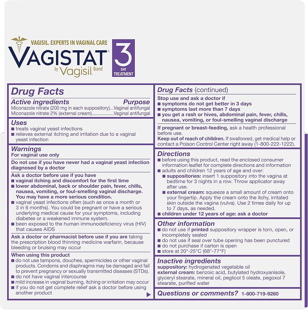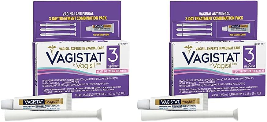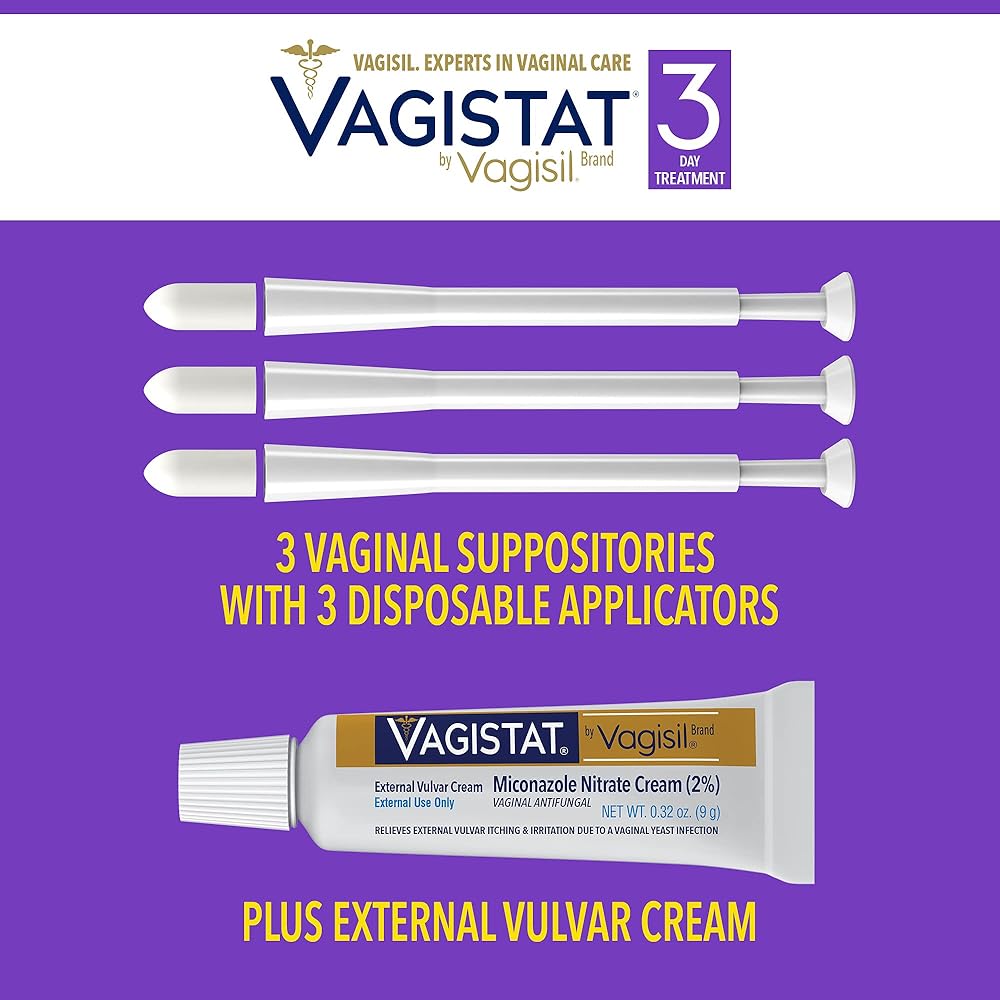 يشمل علاج عدوى الخميرة Vagistat لمدة 3 أيام 3 تحاميل مهبلية من نترات ميكونازول (2٪) (200 ملليغرام) وكريم خارجي مضاد للفطريات المهبلية (0.32 أونصة)