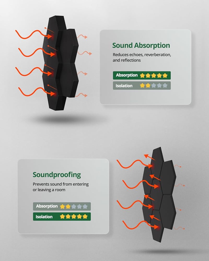 تجربة صوتية محسّنة: يلغي أصداء الصوت البلوري في الاستوديوهات أو غرف الموسيقى أو مساحات الألعاب أو المسارح المنزلية أو المكاتب. التثبيت على الجدران أو الأبواب أو الأسقف أو بالقرب من أجهزة التلفزيون لإنشاء مناطق صوتية محسّنة مع مقاومة للصوت خفيفة.