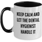 • Make a statement with our Keep Calm and Let the Dental Hygienist Handle It coffee mug and show your friends and family that you're a fan of dental hygienists. Whether you're sipping coffee, tea, or your favorite beverage, this mug is the perfect way to express your appreciation for their hard work and dedication.