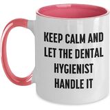 • Show off your appreciation for a dental hygienist with our Keep Calm and Let the Dental Hygienist Handle It two tone coffee mug, available in four color combinations: Black and White, Red and White, Navy and White, and Pink and White, and an 11oz capacity, making it a ideal gift for birthdays and special occasions.