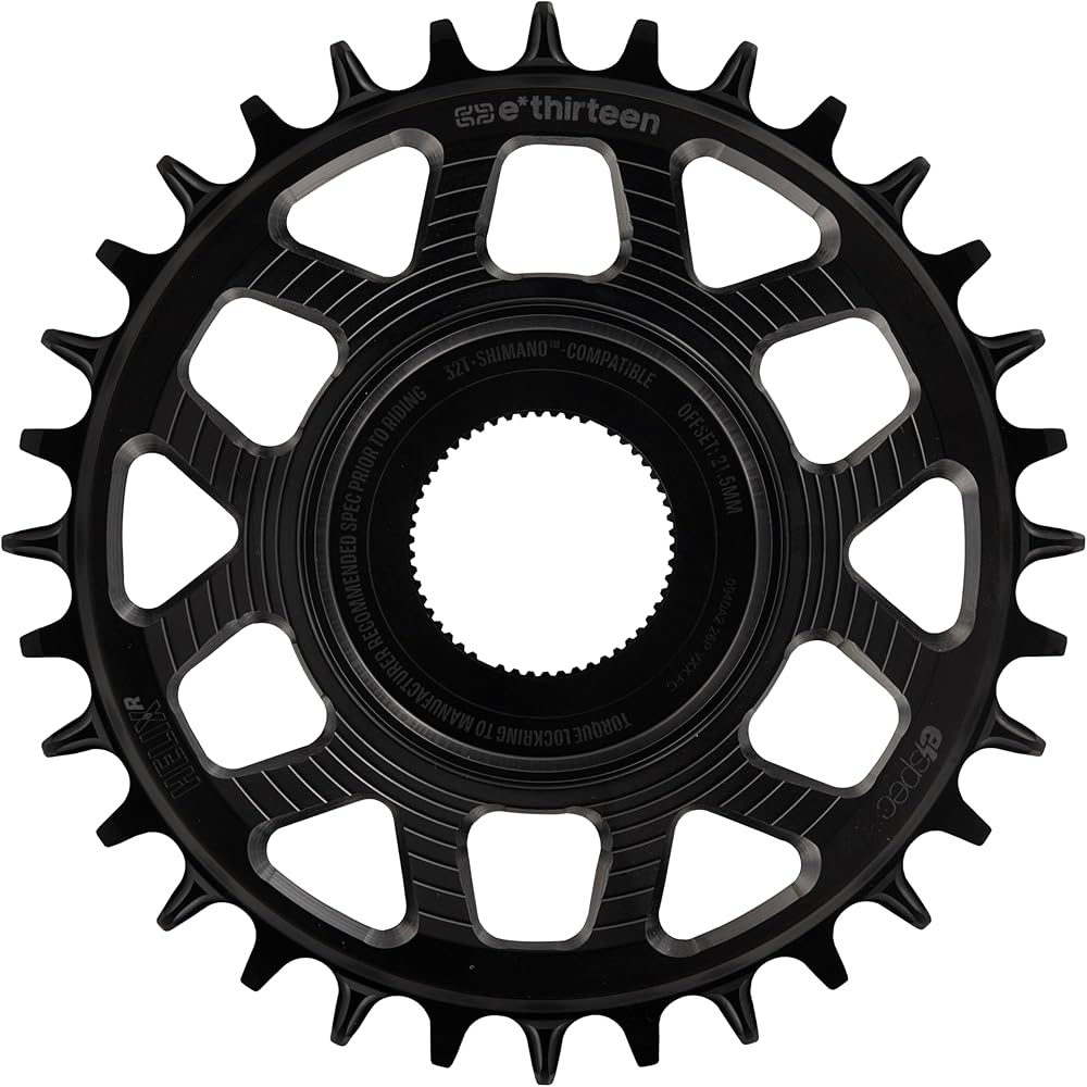 32/34T sizes complement e*thirteen wide range cassettes, Pairs perfectly with Helix Race e*spec Cranks. Forged-CNC 7075 AL for ultralight weight, with high strength, stiffness, and wear-life.