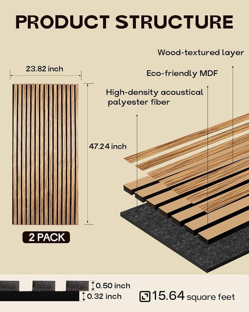 التحكم الفعال في الضوضاء من أجل السلام الحقيقي: تم تصميم كل لوحة حائط مع 8 مم عالية الكثافة (1400GSM) وشرائح MDF 12 مم ، مما يقدم أداءً حقيقياً للتخميد الصوتي. قلل من أصداء ، وتخفيف الضوضاء المحيطة ، واستمتع بلحظات هادئة في مكتبك أو غرفة النوم أو الاستوديو.