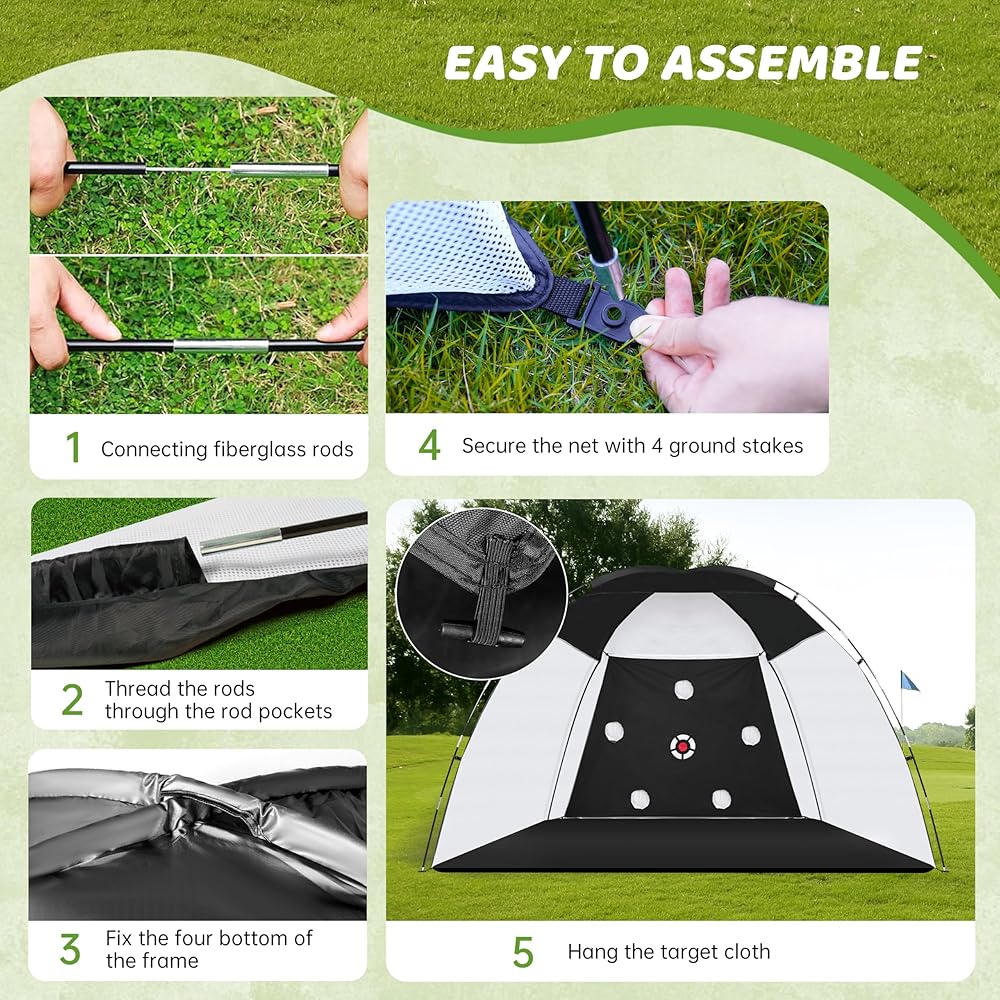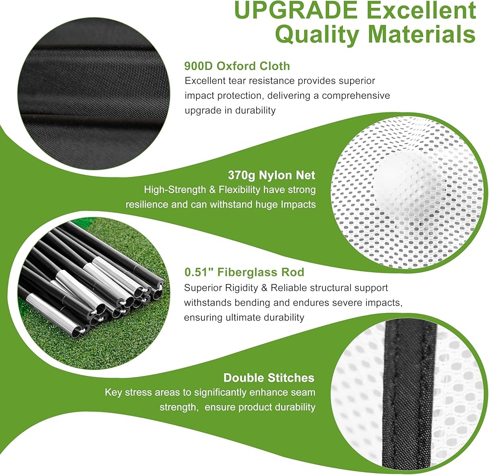 المواد المتينة عالية الجودة-تتكون شبكة الجولف الداخلية من قطعة قماش أوكسفورد 600D وشبكة نايلون ممتصة 270 جرام ، مما يقلل بشكل فعال من الضوضاء. ميزات متينة 0.45 بوصة الألياف الزجاجية لمقاومة التأثير الاستثنائية.