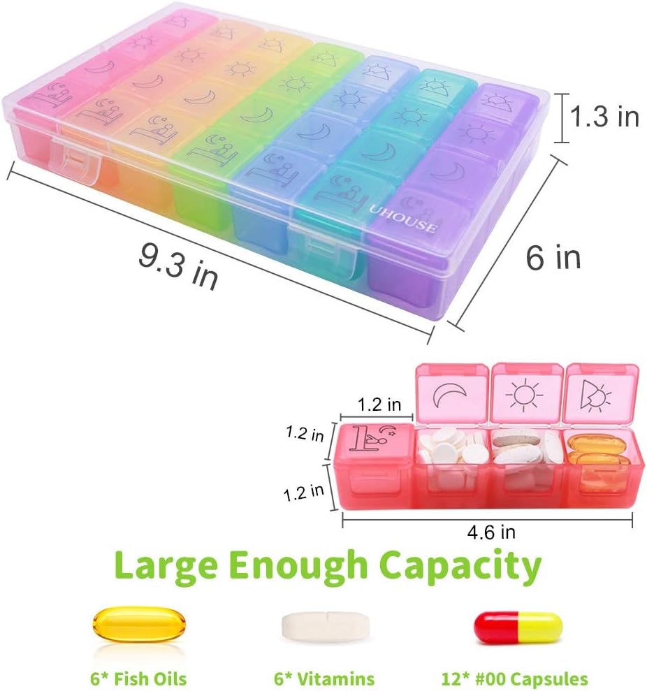 سعة كبيرة -- يمكنك ببساطة تنظيم منظم حبوب الدواء الأسبوعي 4 مرات في اليوم في بداية الأسبوع، كل قسم يمكن أن يحمل ما يصل إلى 6 زيوت أسماك أو 6 فيتامينات كبيرة للاستخدام اليومي.