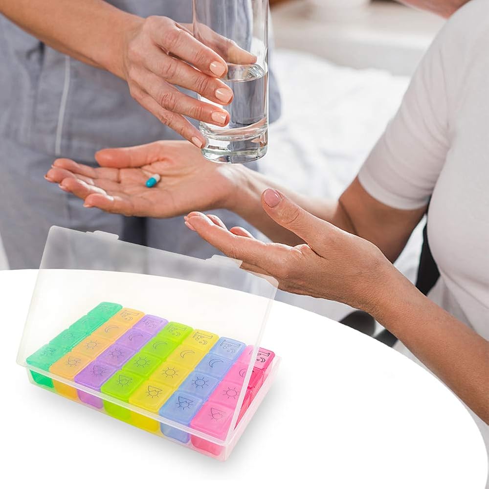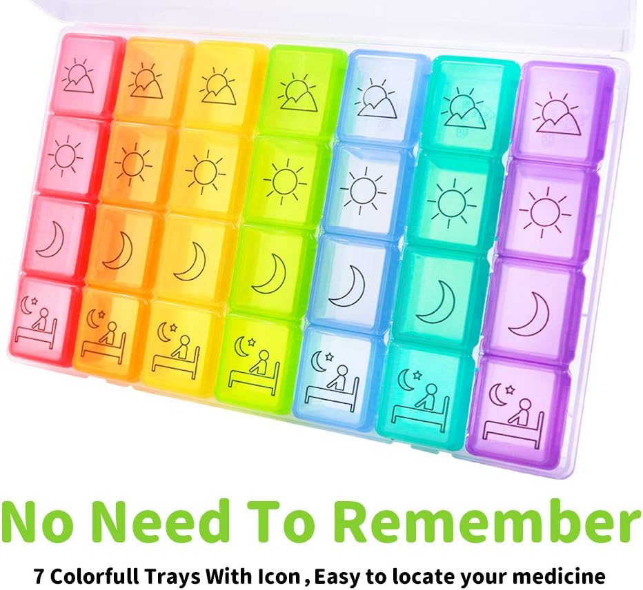 لا حاجة للتذكر -- 7 صواني ملونة مع أيقونات، يسهل تحديد دوائك، وتذكرك بأخذ الدواء في وقت الرنين، لن تختلط حبوب الدواء أبدًا.