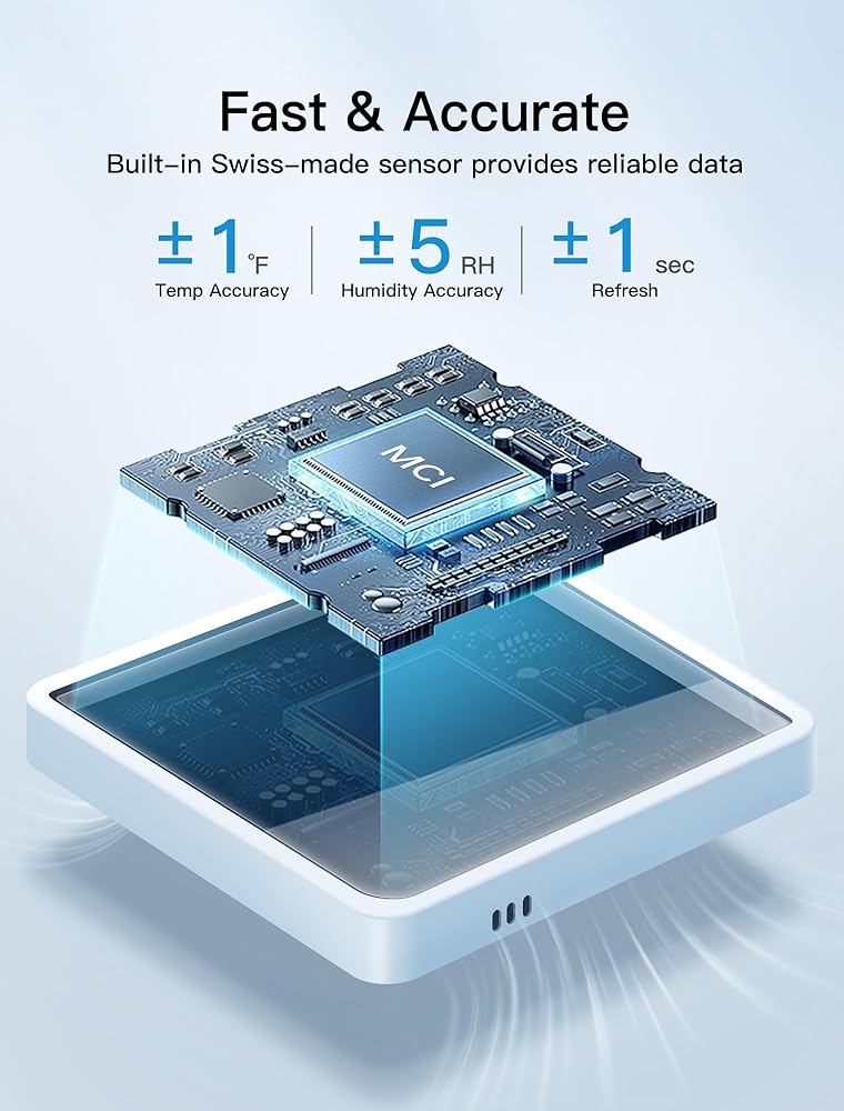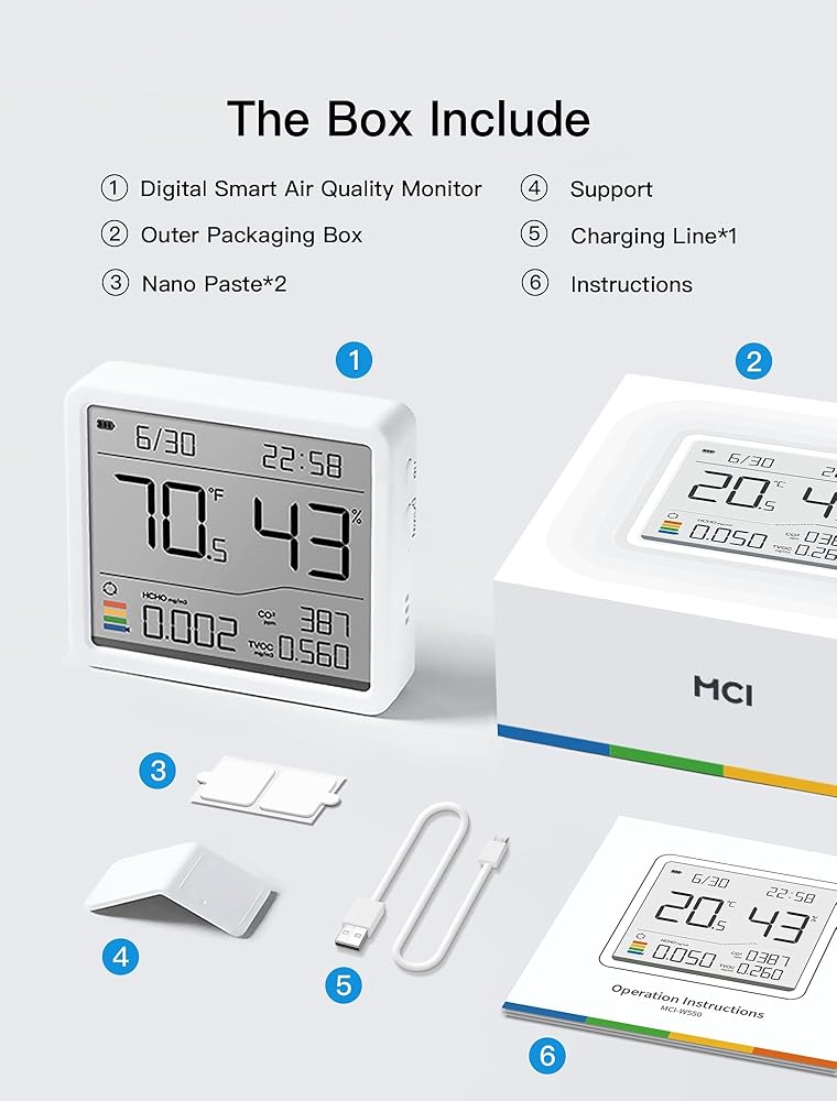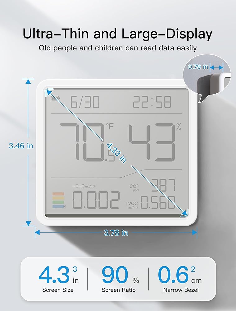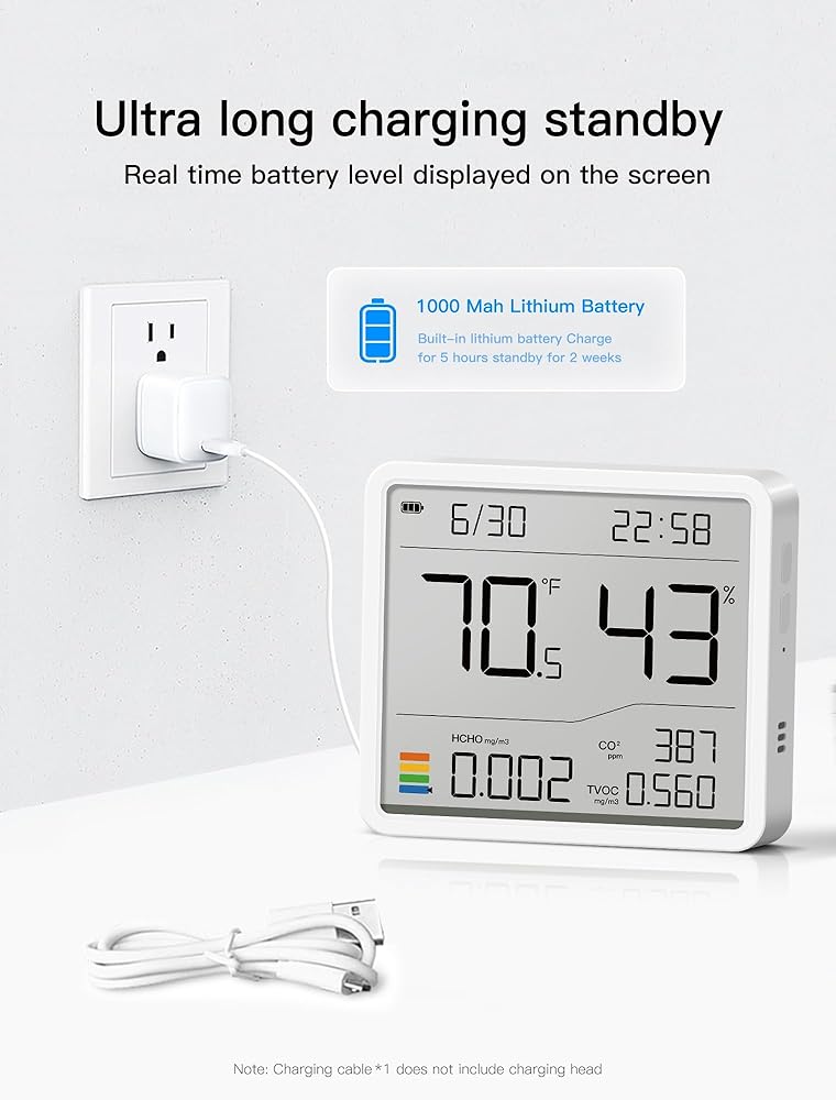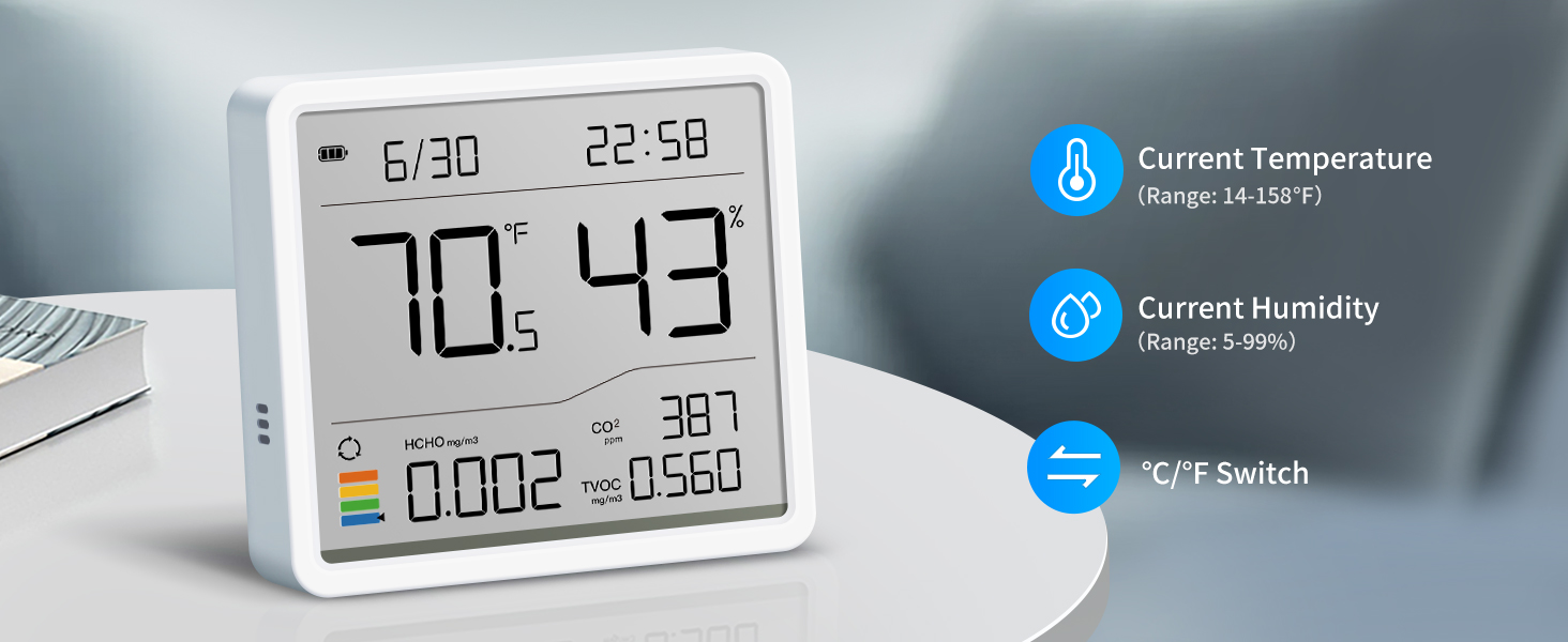 تقنية المستشعر عالي الدقة: مزود بأجهزة استشعار متقدمة من السويسريين ، يوفر شاشتنا بيانات في الوقت الفعلي بمعدل تحديث لمدة ثانية واحدة. حافظ على اطلاع وتفاعل بسرعة مع التغييرات في جودة الهواء ، مما يضمن أن تظل مساحاتك آمنة وصحية