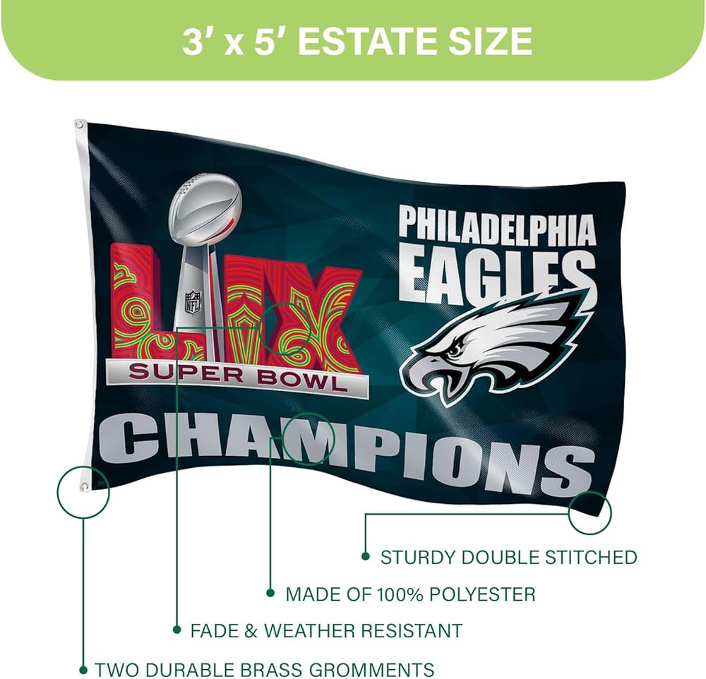SHOW YOUR TEAM PRIDE: Celebrate your Super Bowl LIX Champion Philadelphia Eagles! Our officially licensed 3x5 flags will have you cheering and remembering this moment! Adding a touch of team spirit to your home, office, man cave, dorm. Perfect for Philadelphia Eagles fans, it also makes a unique gift for him or her. (Explore our store for more sports gifts)