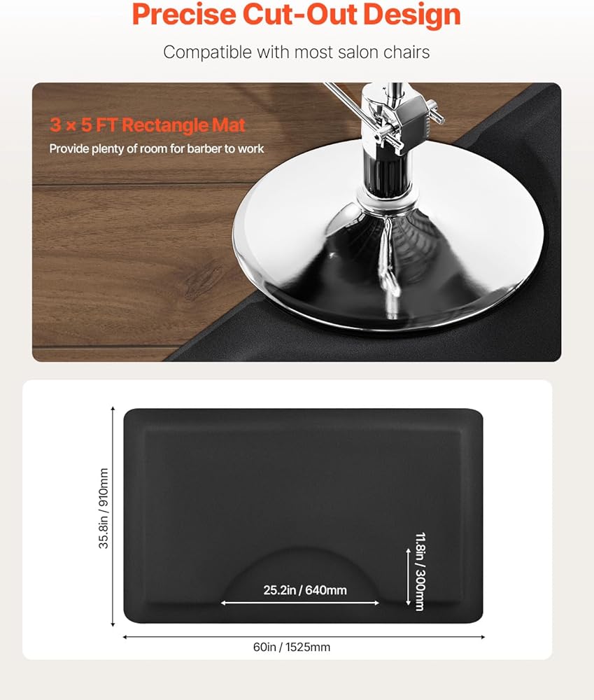 الحجم الكبير: يوفر حصيرة صالون مستطيل 3 × 5 قدم لمصميات الشعر منطقة دائمة واسعة ، مما يسمح للحلاقين بالتحرك بحرية والعمل بشكل أكثر كفاءة. يناسب القطع 25.2 "× 11.8" (640 × 300 مم) معظم كراسي الصالون مع قاعدة مستديرة ، ويبقى في مكانه بشكل آمن دون التحول