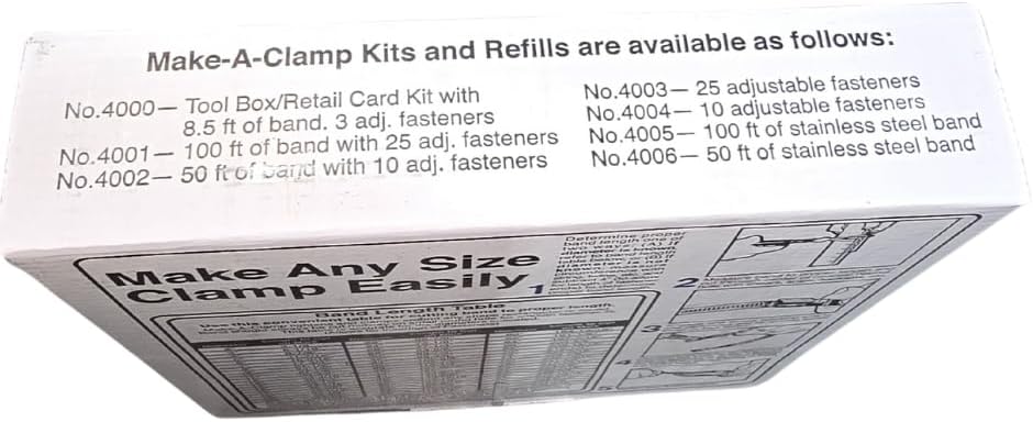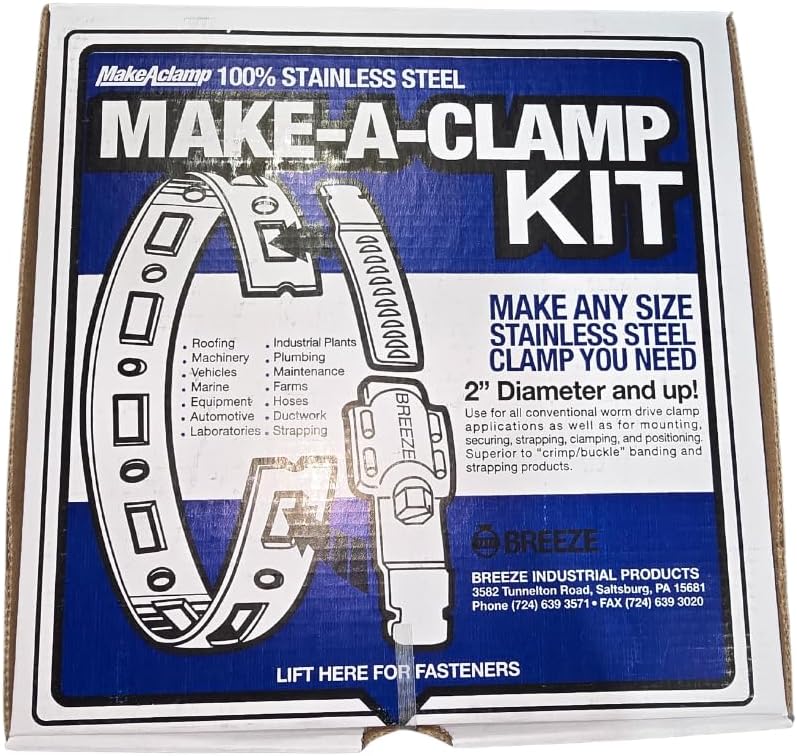 Create custom clamps with ease using the Breeze Make-A-Clamp Kit 4002. This versatile kit includes a 50-foot stainless steel band, 10 adjustable fasteners, and 5 band splices, allowing you to make clamps of any size starting from a 3-inch diameter. The stainless steel construction ensures durability and resistance to corrosion. Perfect for a variety of applications, this kit provides a reliable and adjustable clamping solution.