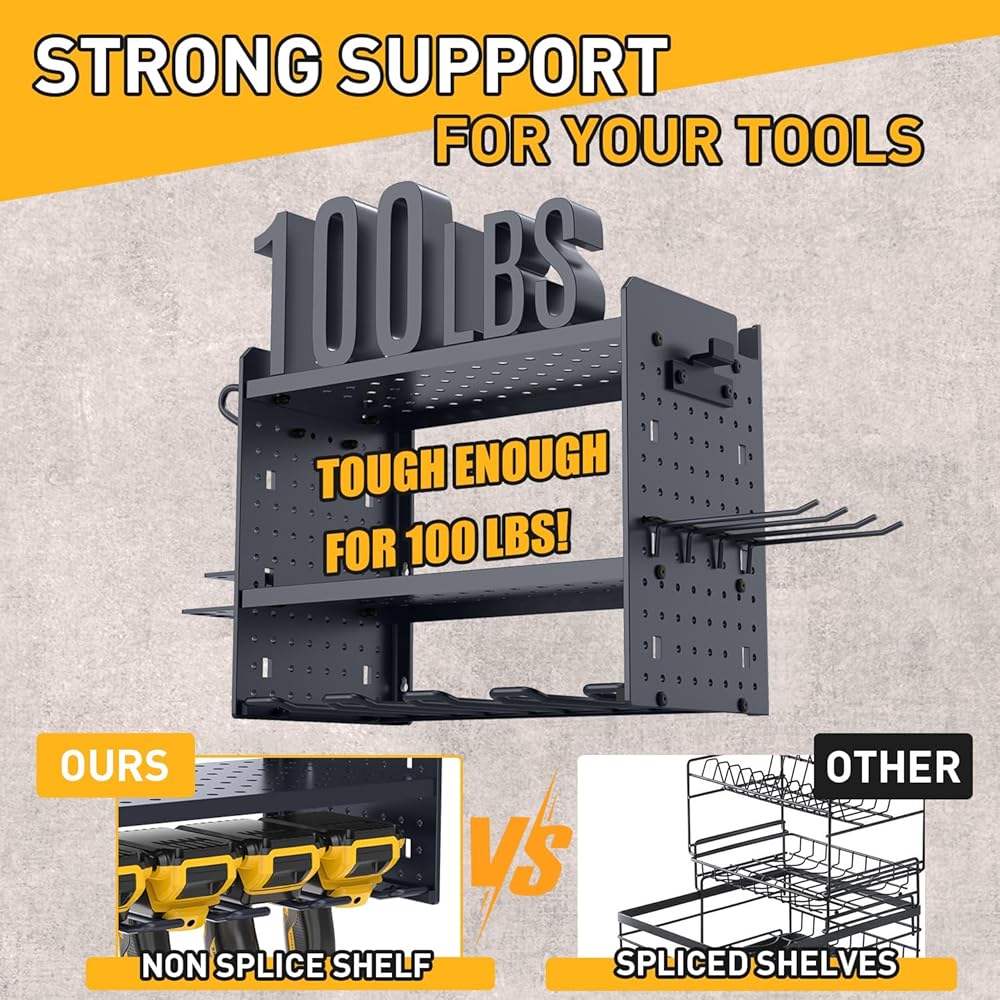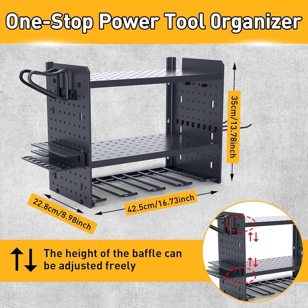 أدوات الرفوف الحجم: حجم منظم أدوات الطاقة L16.9 "، W9" ، H13.7 "، يمكن ضبط ارتفاع القسم الأوسط وفقًا لاحتياجاتك الخاصة ، ويتم إصلاح الارتفاع. كل ثقب مناسب للتركيب وهو كبير بما يكفي لوضع الشاحن والبطارية.