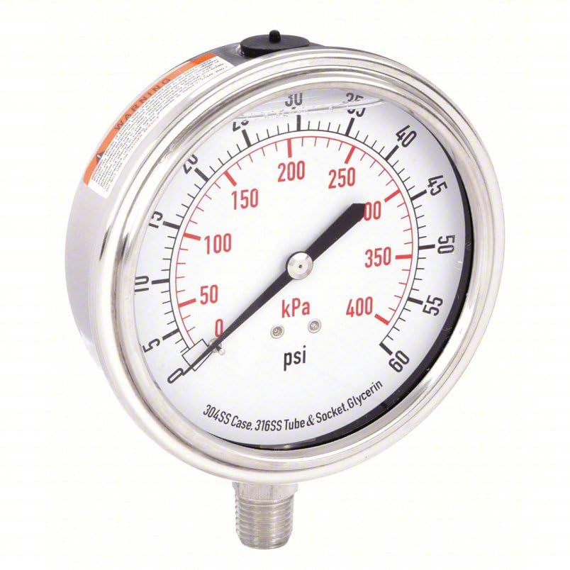 This stainless steel pressure gauge is a reliable and durable instrument designed for accurate pressure measurement. With a 3 1/2 inch face and a range of 0-60 PSI, it's perfect for monitoring various industrial and commercial applications. The liquid-filled design dampens vibrations and pulsations, ensuring smooth and precise readings. Constructed from high-quality stainless steel, this pressure gauge is built to withstand harsh environments and provide long-lasting performance. Its clear and easy-to-read dial makes it convenient for quick pressure checks. Whether you're working in a factory, workshop, or any other setting that requires pressure monitoring, this gauge is an essential tool for maintaining optimal system performance.