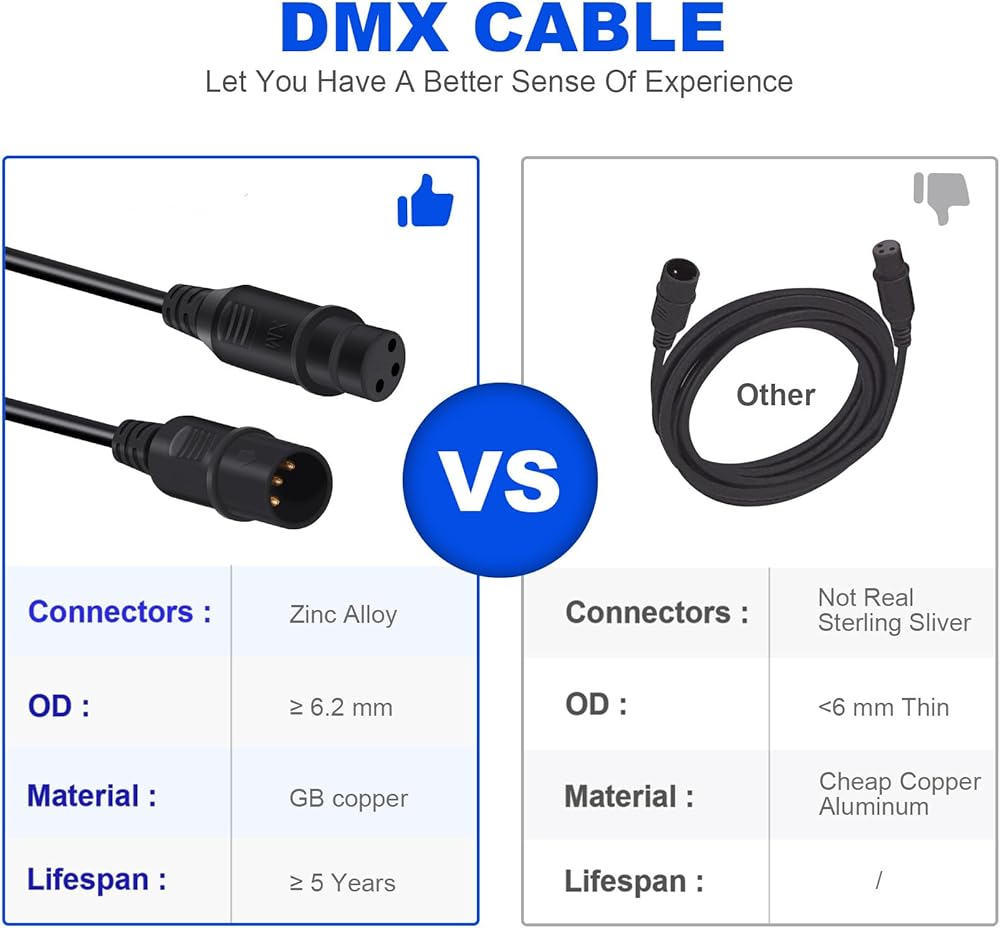 • كابل الجودة: يتكون هذا الذكور إلى الكابل من DMX إلى PVC دائمة ومرنة. تحمي سترة PVC الكابل من التلف والتآكل ، في حين أن قائد النحاس مقاوم للتآكل.