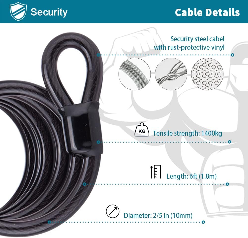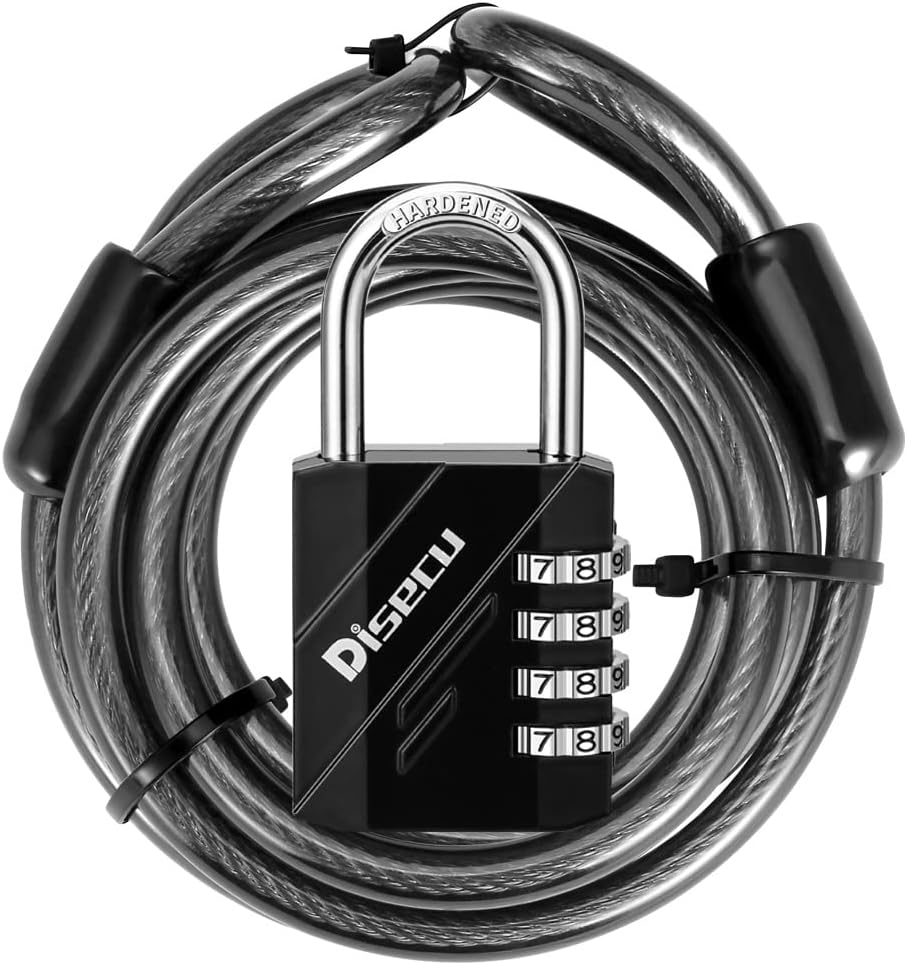 • High Security: 4-digit combination lock offers keyless convenience, with 10,000 possible combinations, the 4 number code lock is 10 times more difficult to crack than a 3-digit lock. A braided galvanized steel security cable with a rust-resistant vinyl coating enhances cut resistance while the vinyl covering protects the steel cable from rust and prevents scratching