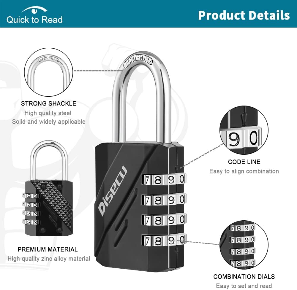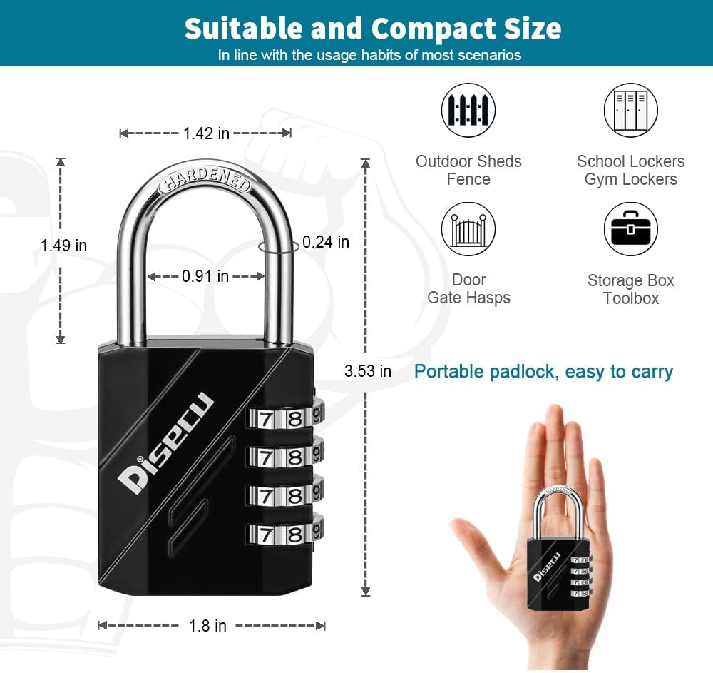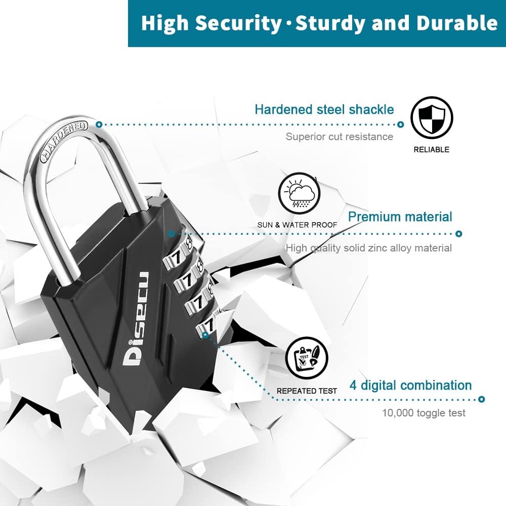 • Sturdy and Durable: The combo padlock is crafted from hardened zinc alloy and plated steel, featuring a cast metal body. It offers rust resistance, waterproof, and is resistant to cutting and sawing