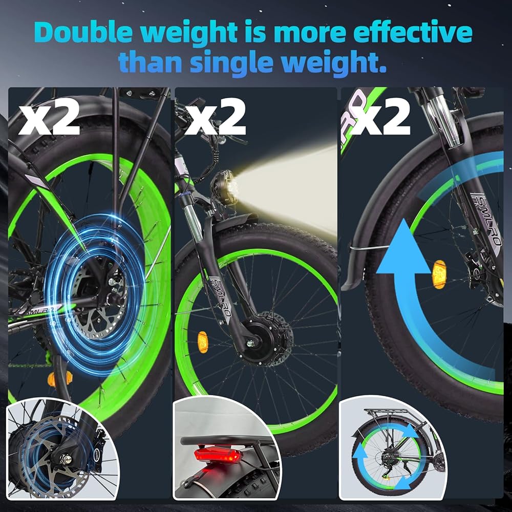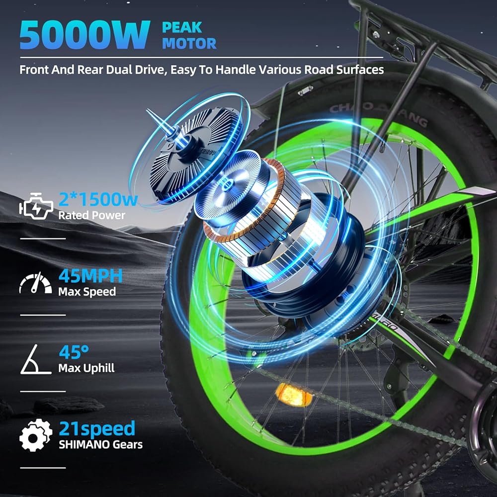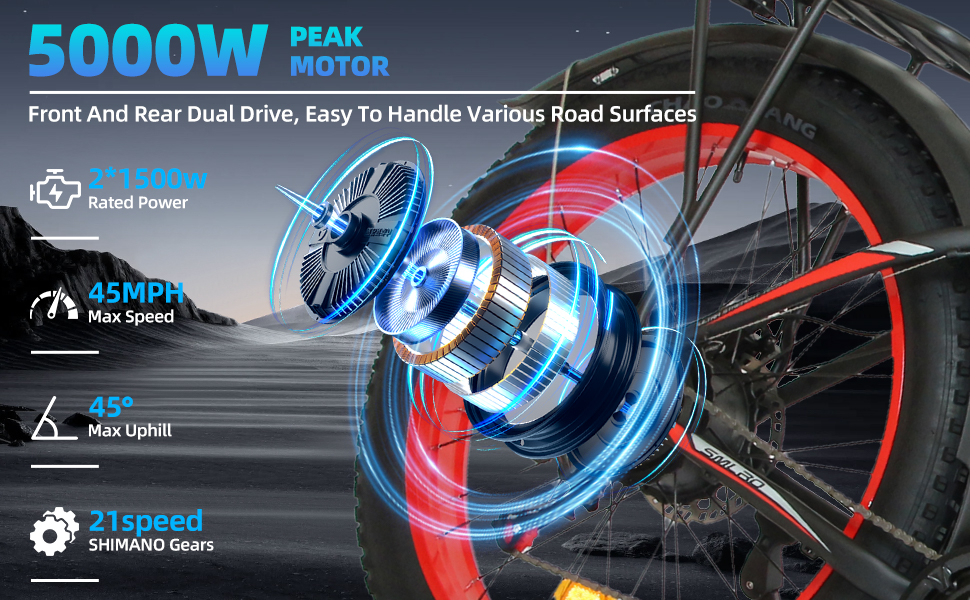 5000 واط قوة محرك: مع محركات Naexro Peak 5000W المزدوجة ، قهر أي تضاريس ، وتوفير> 2 × 85 نانومتر من عزم الدوران ، وتسلق سهولة 45 درجة ، وتحقيق سرعات مثيرة 45 ميل في الساعة. من التلال الحادة إلى المسارات الوعرة ، تهيمن دراجاتنا الكهربائية عالية الأداء على مغامرات التنقل الحضري والطرق على الطرق الوعرة ، مما يضمن ركوب ناعم حريري