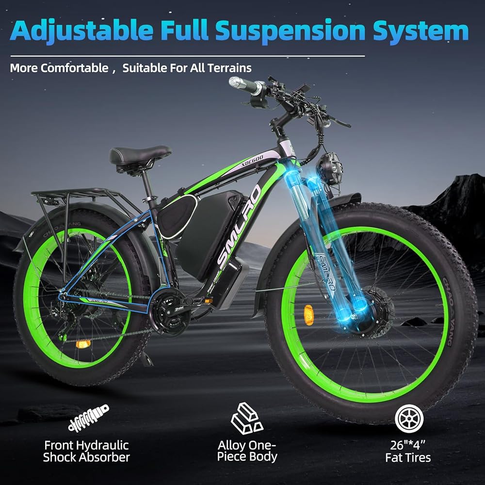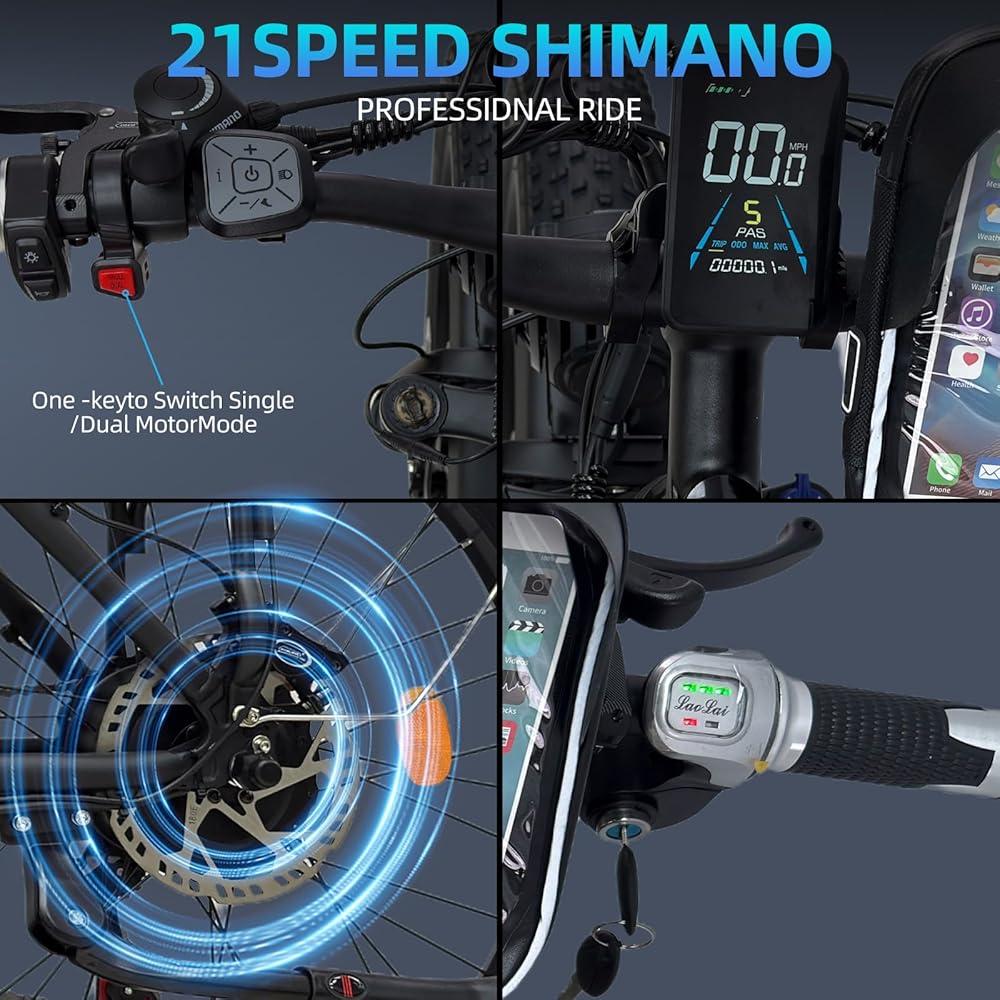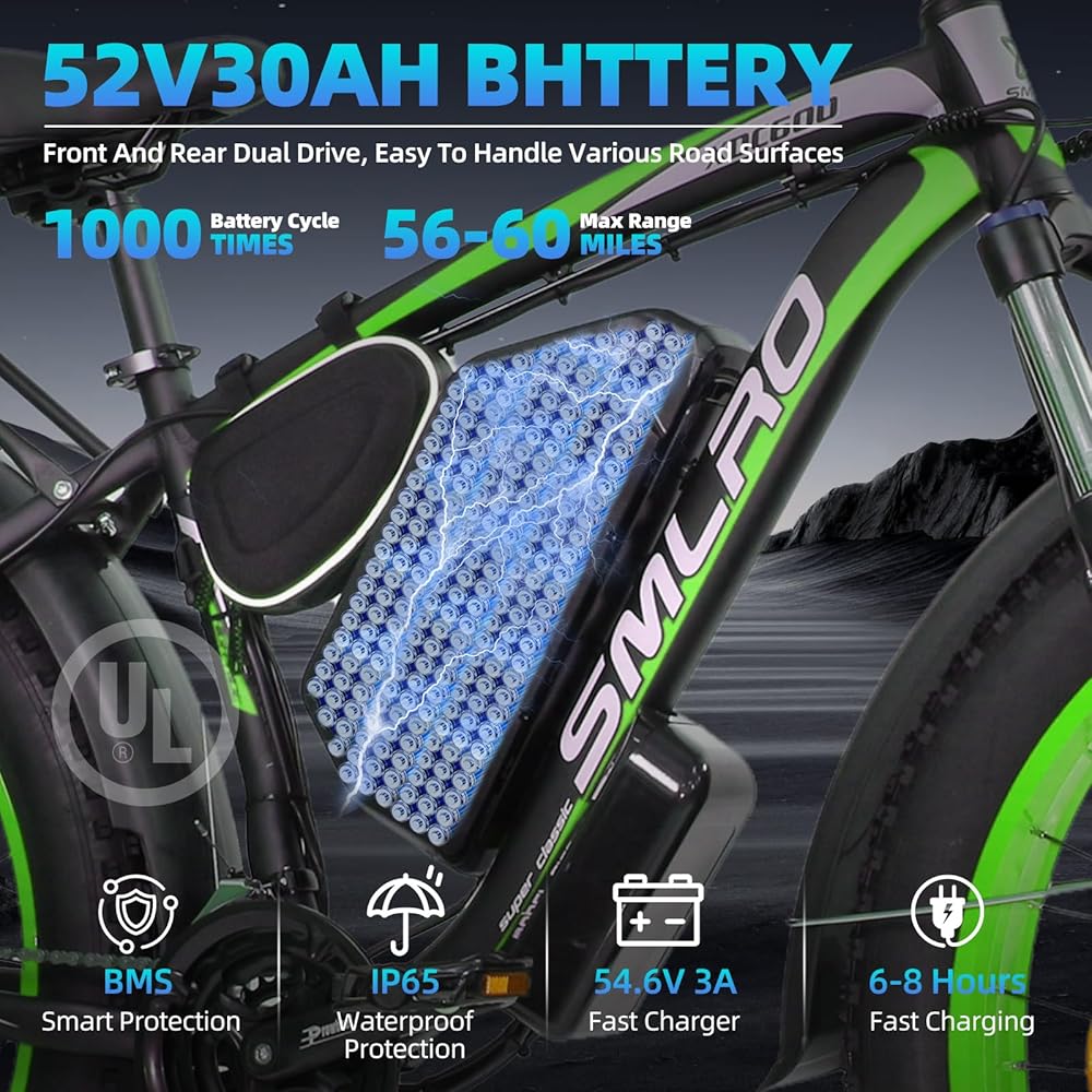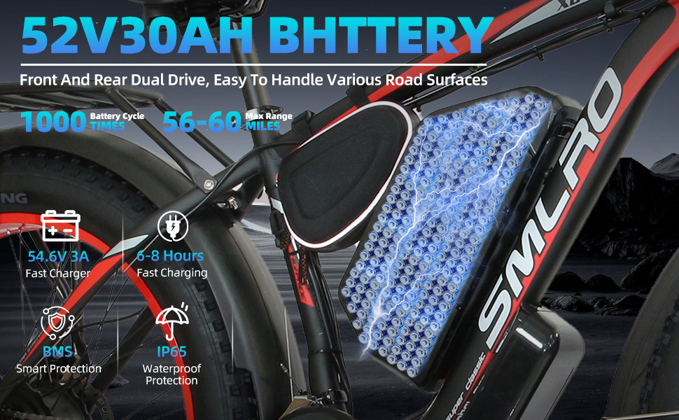 بطارية معتمدة من 52 فولت 30AH UL: مزودة ببطارية ليثيوم مقاومة للماء 52V 30AH (معتمدة من قبل UL Safety) ، يمكنها الاستمتاع بما يتراوح بين 70 و 80 ميلًا من نطاق الكهرباء الخالصة أو 100-120 ميل من نطاق الركوب المساعد. 8-9 ساعة تصميم شحن سريع ، بما في ذلك حماية الأمان المفتاح المزدوج. ملاحظة: يختلف المدى اعتمادًا على وزن/التضاريس