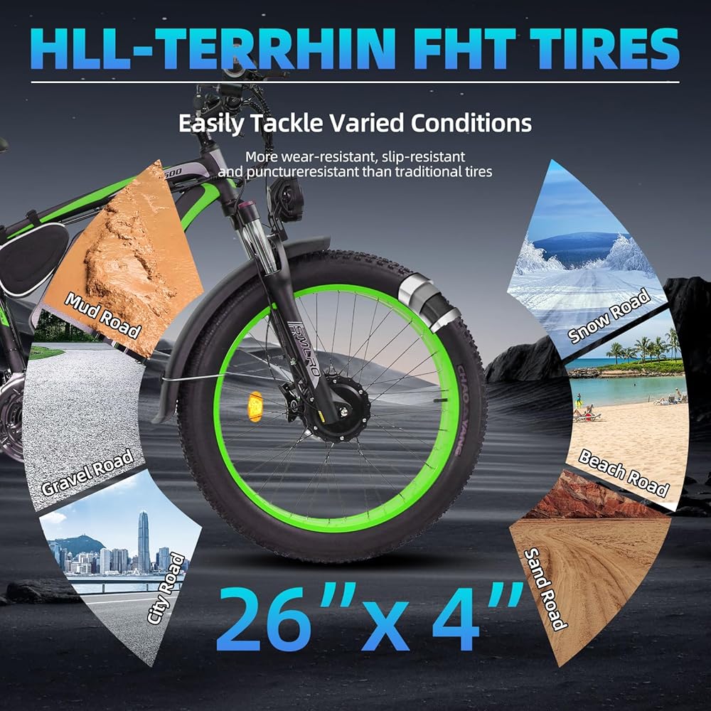 جميع مزايا التضاريس: 26 بوصة × 4.0 بوصة إطارات ونظام تعليق الشوكة الأمامية القابلة للقفل ، والذي يمكن أن يمتص المطبات بشكل فعال ويوفر ركوبًا مستقرًا للغاية. يمكن أن توفر فرامل الأقراص الهيدروليكية المزدوجة قوة فرملة فورية في أي ظروف جوية ، ويمكن أن يؤدي ناقل الحركة 7 سرعات إلى تحسين كفاءة الدواسة عند ركوب المنحدرات