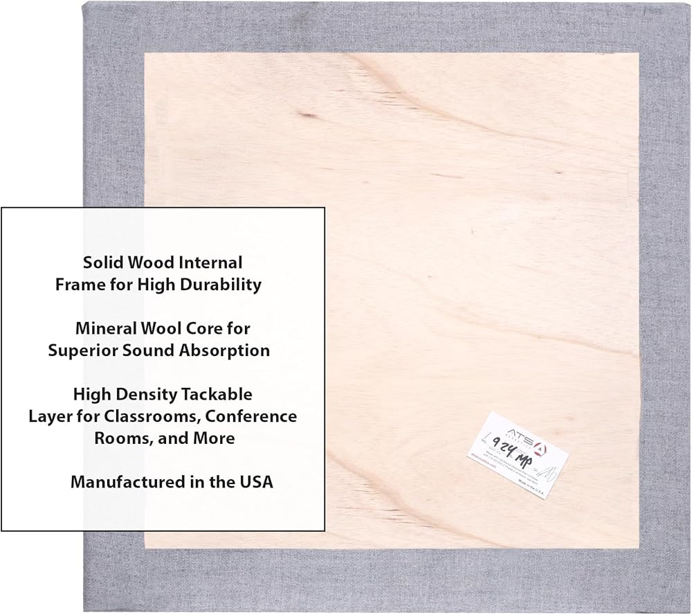 ATS Acoustics professional studio quality acoustic panels, now with a tackable surface. This product features a solid wood internal frame to protect edges and corners from dents and damage. The super effective sound absorbing mineral wool core is topped with a high density layer to provide a tackable surface, perfect for studios, offices, and classrooms. The panel is wrapped in ATS Acoustics exclusive Sona line of Guilford of Maine acoustical fabric in a variety of colors to match any décor. This product is Fire Rated Class 1 or Class A per ASTM E84, and features a Noise Reduction Coefficient (NRC) of 1.05 out of 1. The average weight per panel is 7 pounds, and it is as simple to hang on a wall as a picture, ideal for a temporary or rented space. Installation is easy with included mounting templates and hardware.