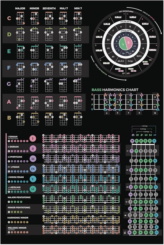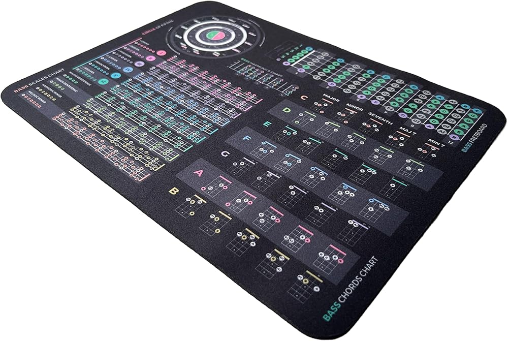 ✔ Covers 4, 5, and 6-string bass fretboards ✔ Visual charts for major, minor, pentatonic, and modal scales ✔ Circle of fifths made simple for quick key changes ✔ Chord chart for major, minor, 7th, and more ✔ Harmonics map for dynamic performance ✔ Smooth neoprene surface and anti-slip base
