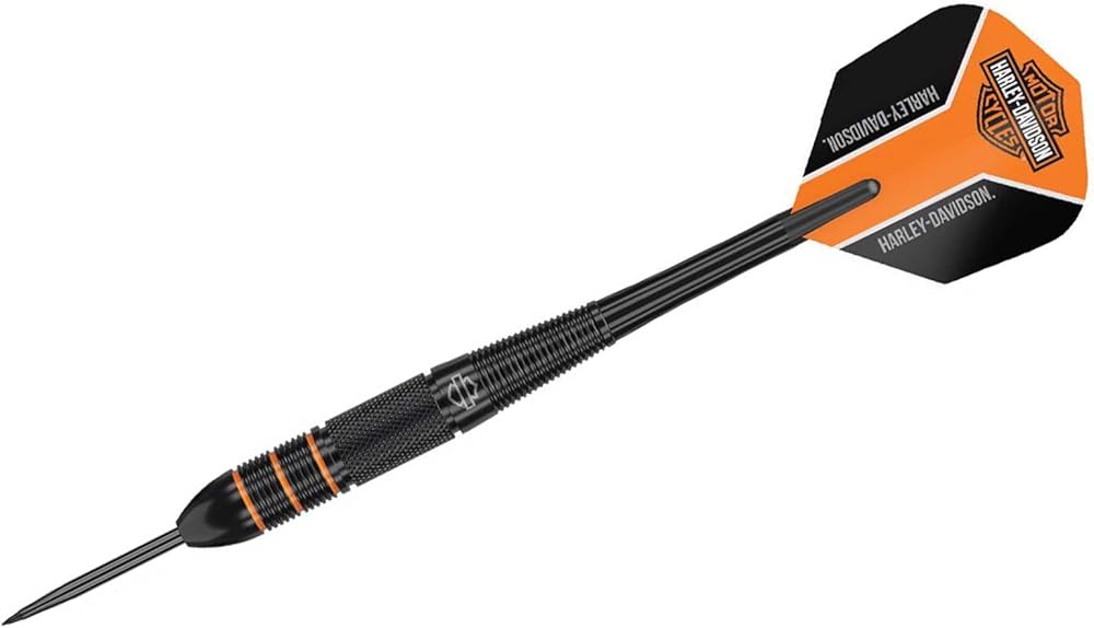 Harley-Davidson Rally Darts, 61243. 22 gram Steel Tip Darts. Includes 6 rally flights and 6 rally shafts. Tri-fold dart wallet. Black coated stainless steel barrels. The perfect darts for your at home board!
