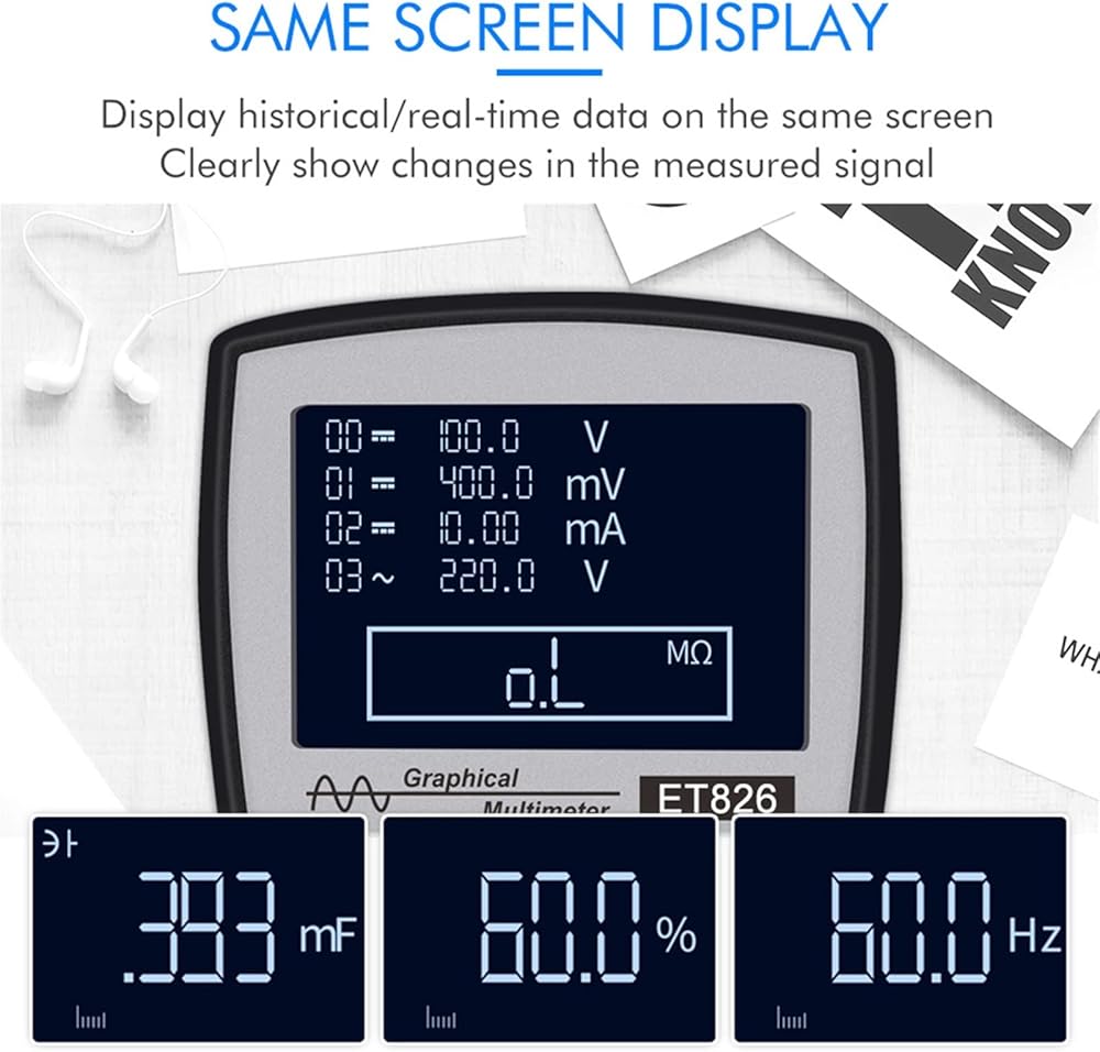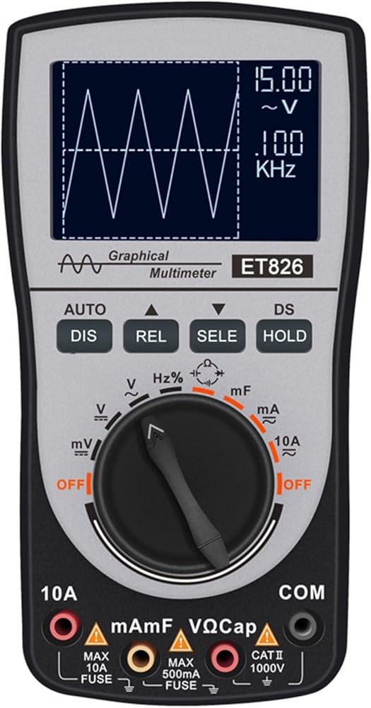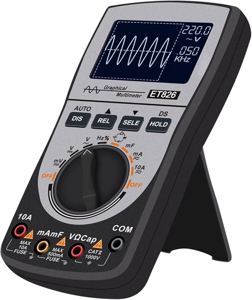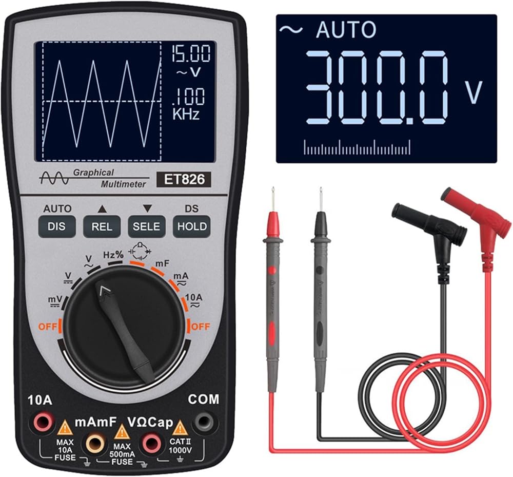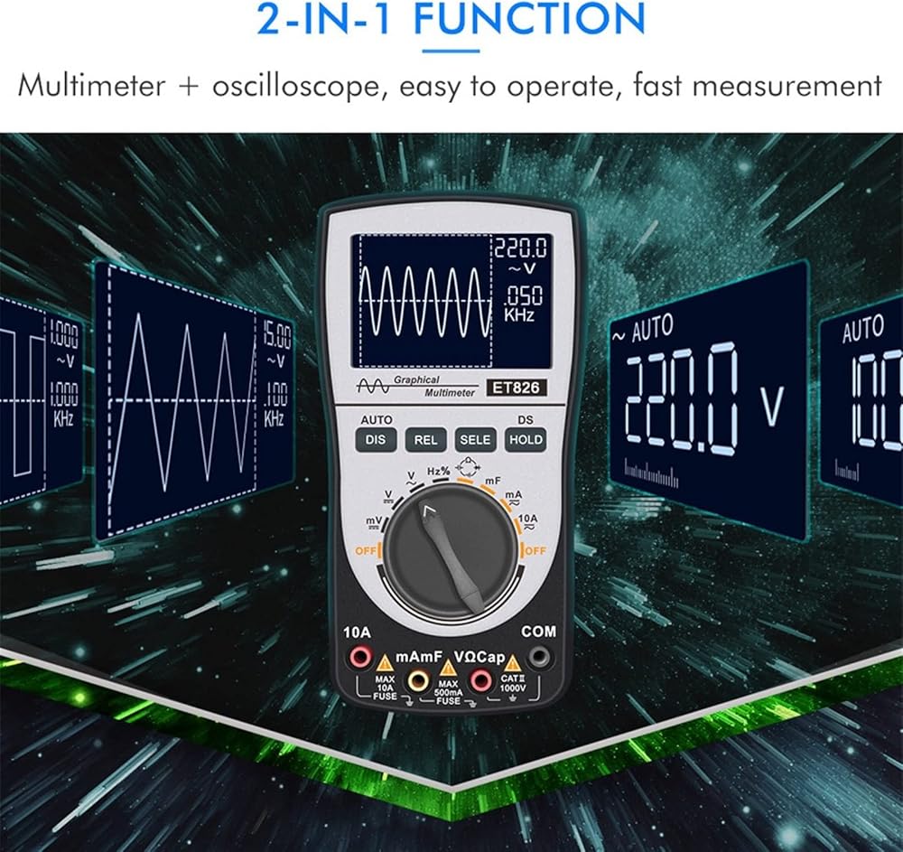 1. The signal generator is small in size, has many functions, easy to operate and easy to carry.2. The key layout is reasonable, all functions have independent corresponding keys, easy to operate.3. Built-in battery, low power consumption, long standby time.1.Bandwidth : ACV/DCV/ACA/DCA 20kHz , 200k high-speed A/D sampling.2.High Definition Display Screen.Digital multimeter with 41-segment analog bar display,200k high-speed A/D sampling,4000 counts auto-range(can be selected manually), one-button switch of graphical waveform display during measurement.3.High reliability with panel calibration technology and memory calibration, sparing the need for adjustment with potentiometer.4.Storing 100 sets of data and 10 waveforms independently.Capable of holding waveform and data during measurement,easy to view and analyze.5.Realizing one-button automatic waveform capture,operator-friendly to learn and operate.Effectively eliminating lead resistance, distributed capacitance orinterference signals with relative value measurement (clearing).Display: LCD display, 128x64dot-matrix graphics, 4000 countsLCD size: 60 x 40mm / 2.4 x 1.6inPower: 3 * 1.5V AA battery (not included)Input resistance: 10MohmAuto sleep: yes (the meter automatically auto sleep in 15 minutes without any operation of button)Power consumption: about 40mAStorage capacity: data: 100 groups, waveform record: 10 groupsOperation environment: 0Celsius+40Celsius; Less than 75%RHStorage environment: -10Celsius+60Celsius; Less than 90%RHColour:black+greyMaterial: ABS Size:160 x 83 x 32mmPackage Contents:1 x Multimeter Oscilloscope(Without dry battery)1 Pair x Test PensOnly the above package content, other products are not included.Note: Light shooting and different displays may cause the color of the item in the picture a little different from the real thing. The measurement allowed error i