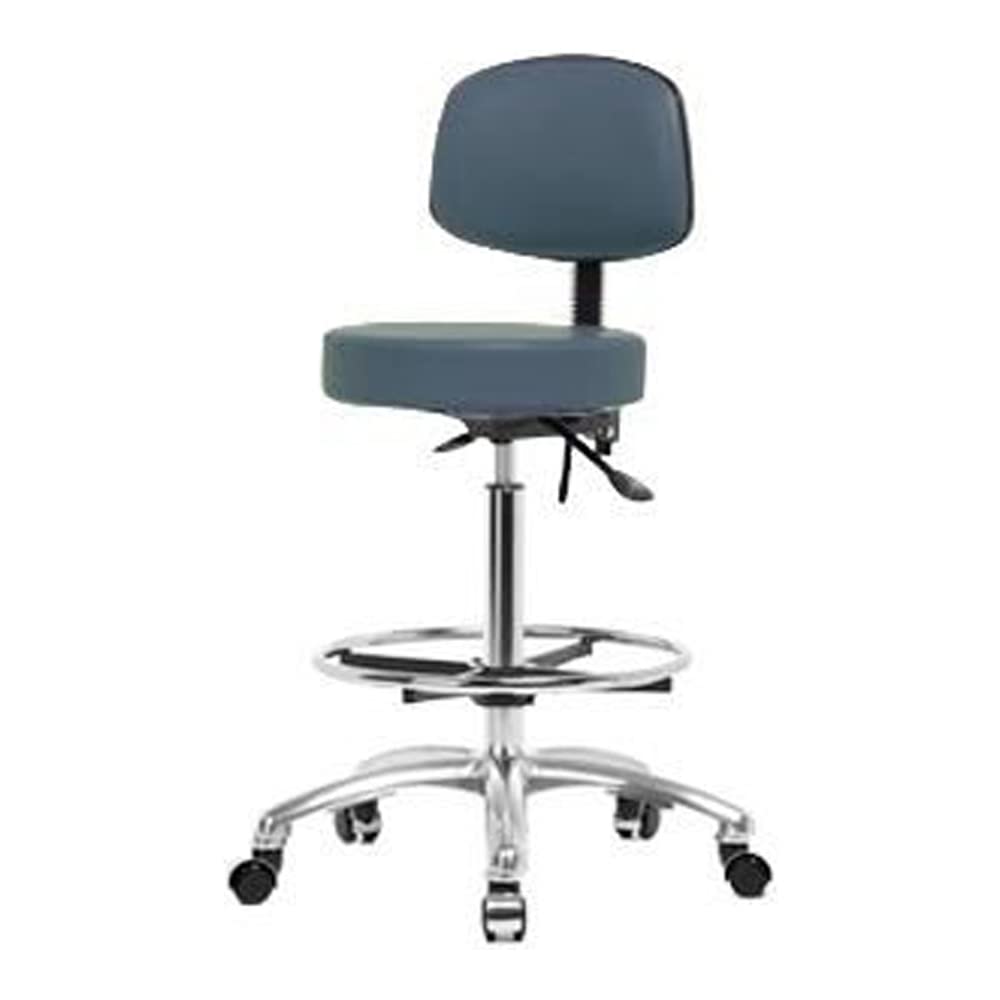 The product Type is vinyl high Bench height stool with back and chrome base, no tilt, chrome foot ring, chrome casters, Navy. Country of origin is United States, manufacturer of this product is Thomas.
