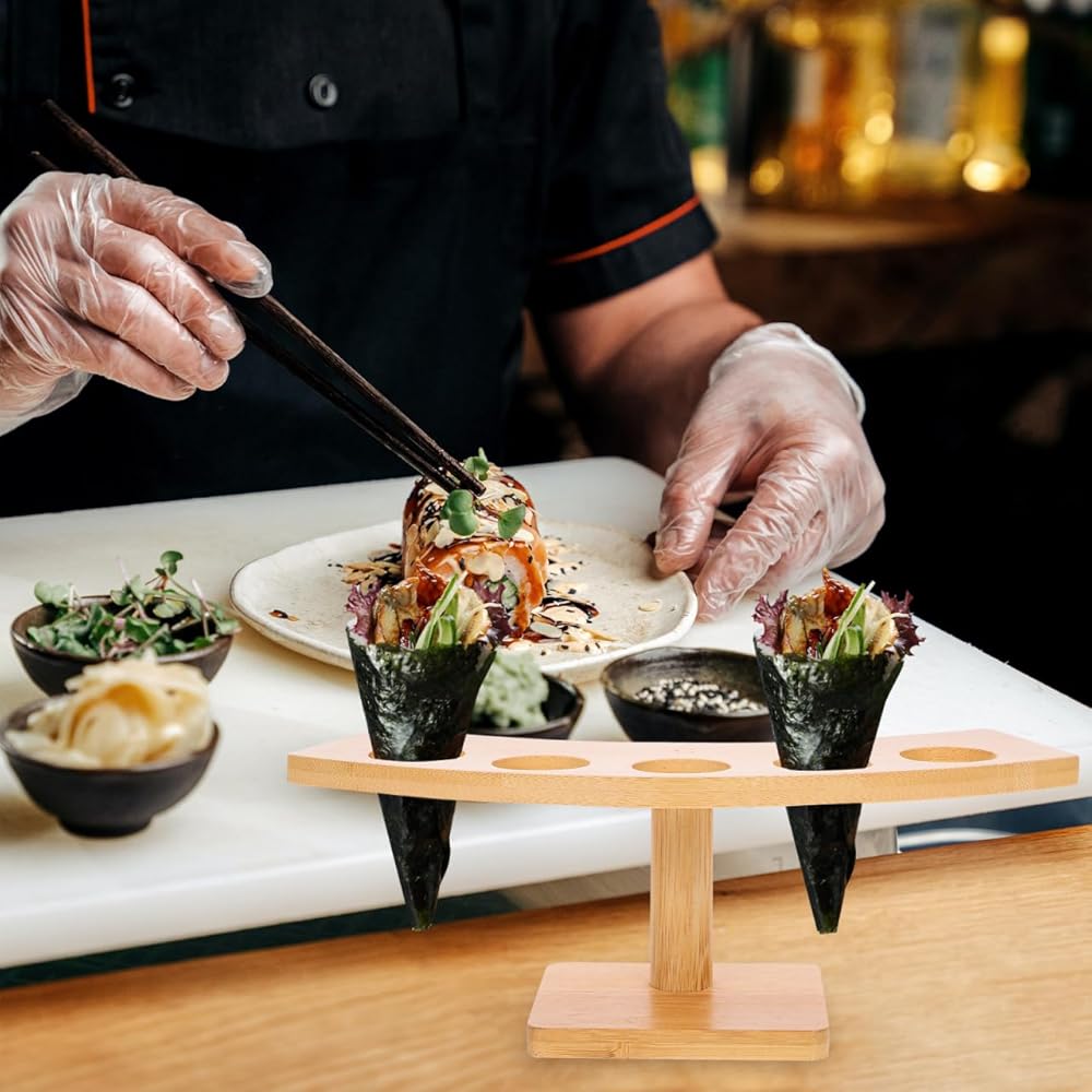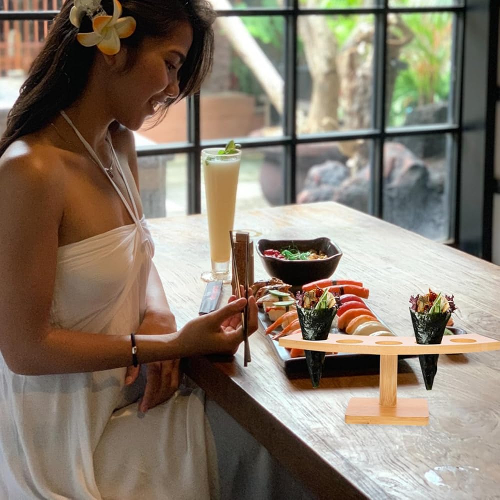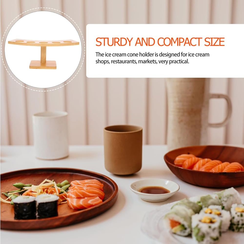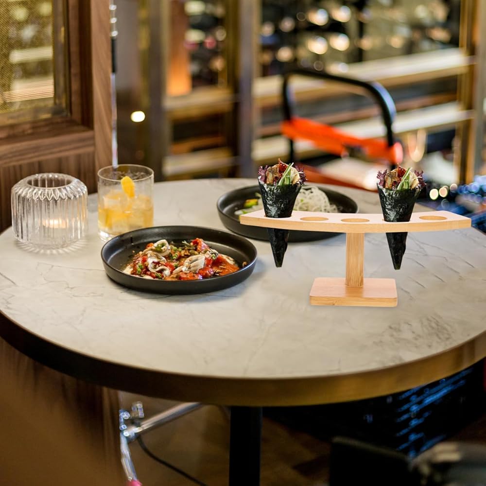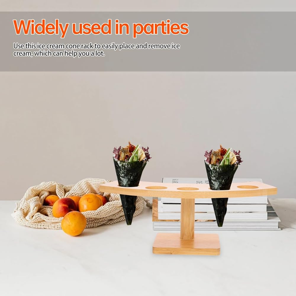 المواد: Sushi Hand Roll Shose Stand مصنوعة من مواد خشبية من الخيزران الطبيعية ، هذا حامل مخروط الآيس كريم ودود وآمن للاتصال بالطعام ، مما يجعله مثاليًا للاستخدام في المنزل والمطعم