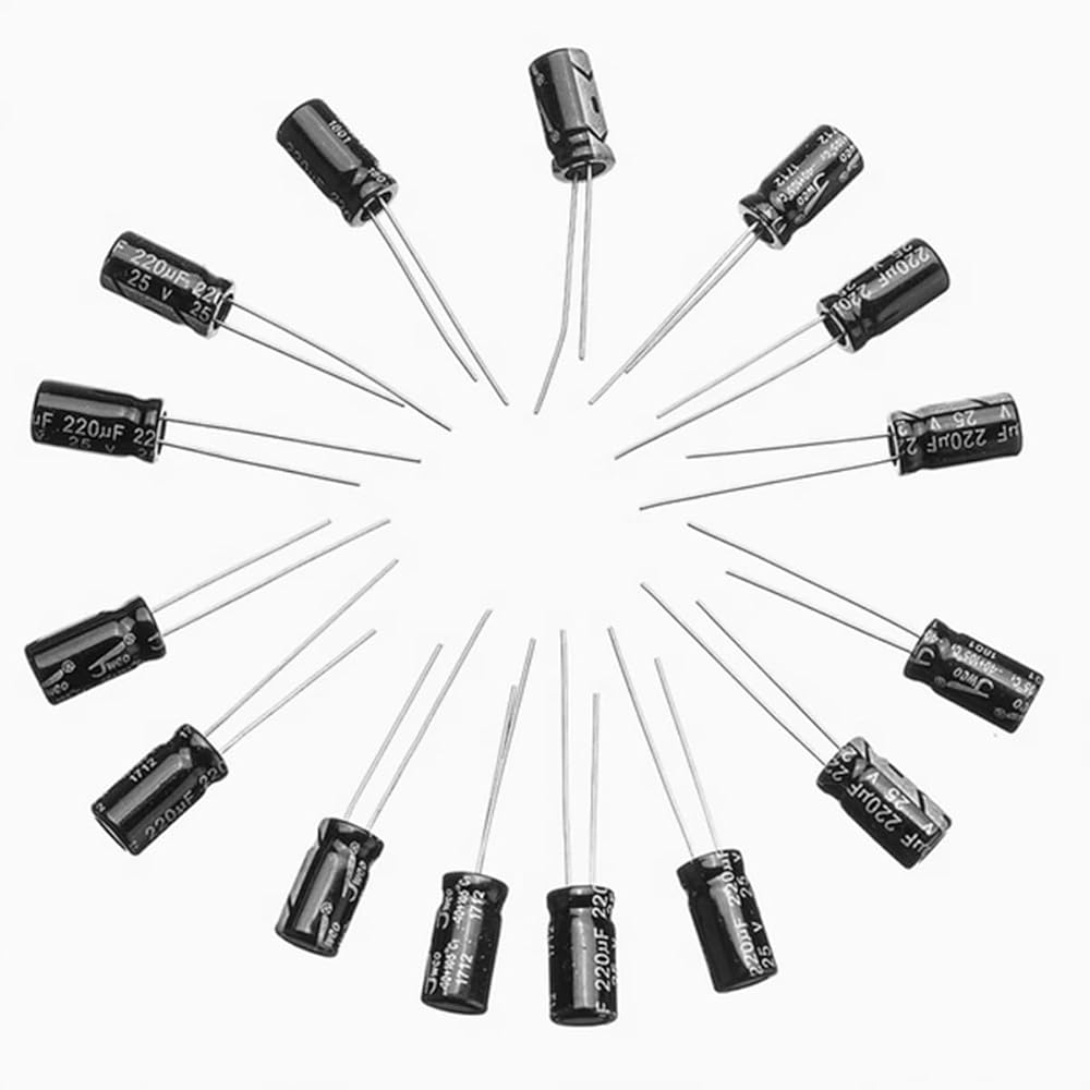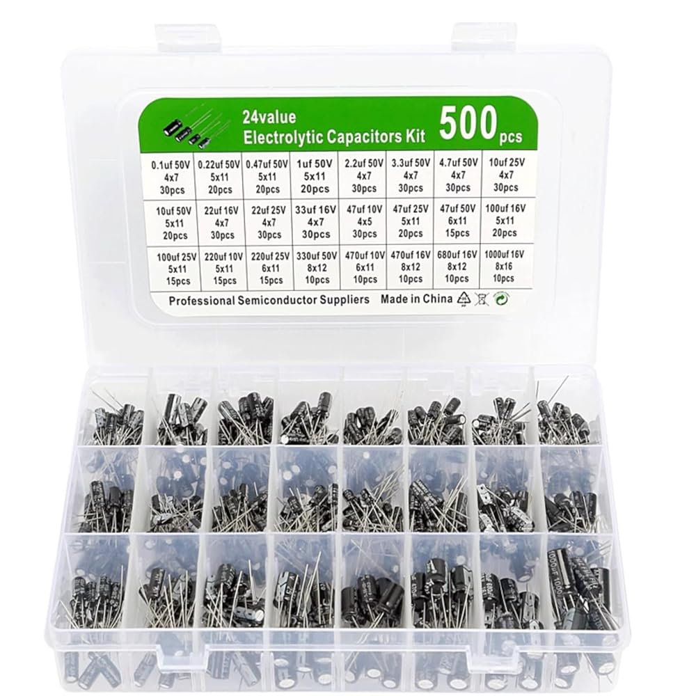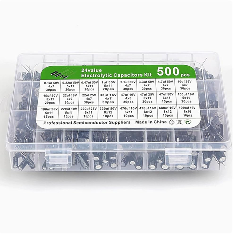 • مجموعة شاملة: تحتوي على 500 مكثفات كهربائية من الألومنيوم في 24 مواصفات مختلفة تتراوح من 0.1 فولت إلى 1000 فور.