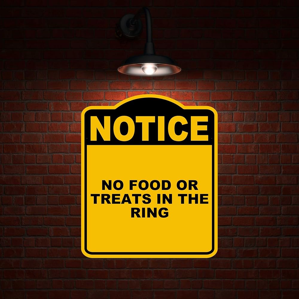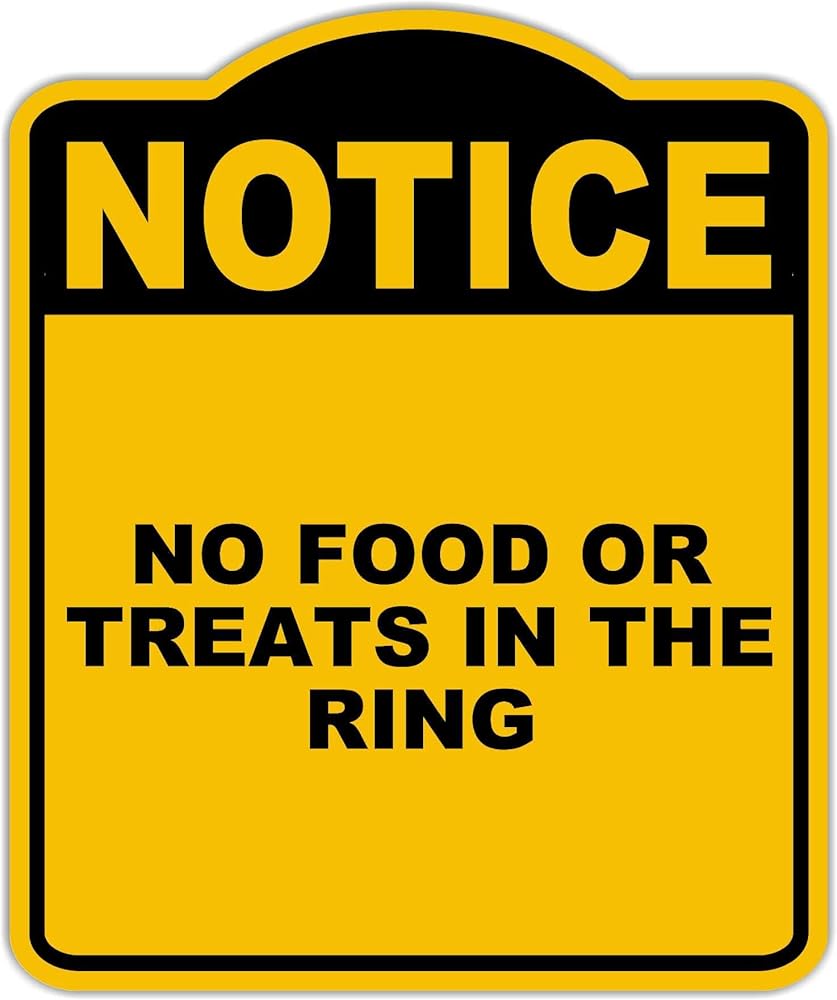 لا يوجد طعام أو حلوى في الحلبة، لافتة مركبة من الألومنيوم باللون الأصفر والأسود مقاس 8.5 × 10 بوصة