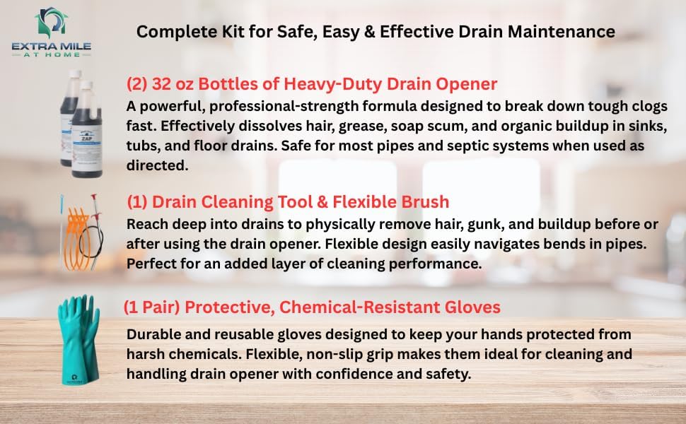 • COMPLETE KIT: Includes two 32 oz bottles of Drain opener, protective gloves, and essential drain cleaning tools for tough clogs